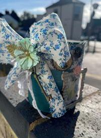 Cortei duas tiras de tecido, com cerca de 4 cm, com a cola quente colei um pedaço na lata, desfiado mesmo, fiz um laço e colei sobre a junção do tecido.
