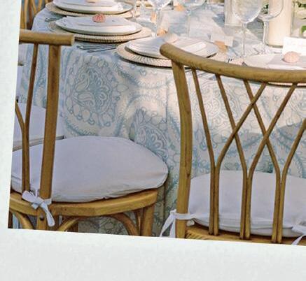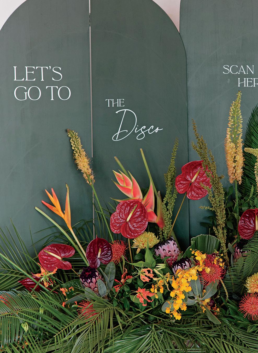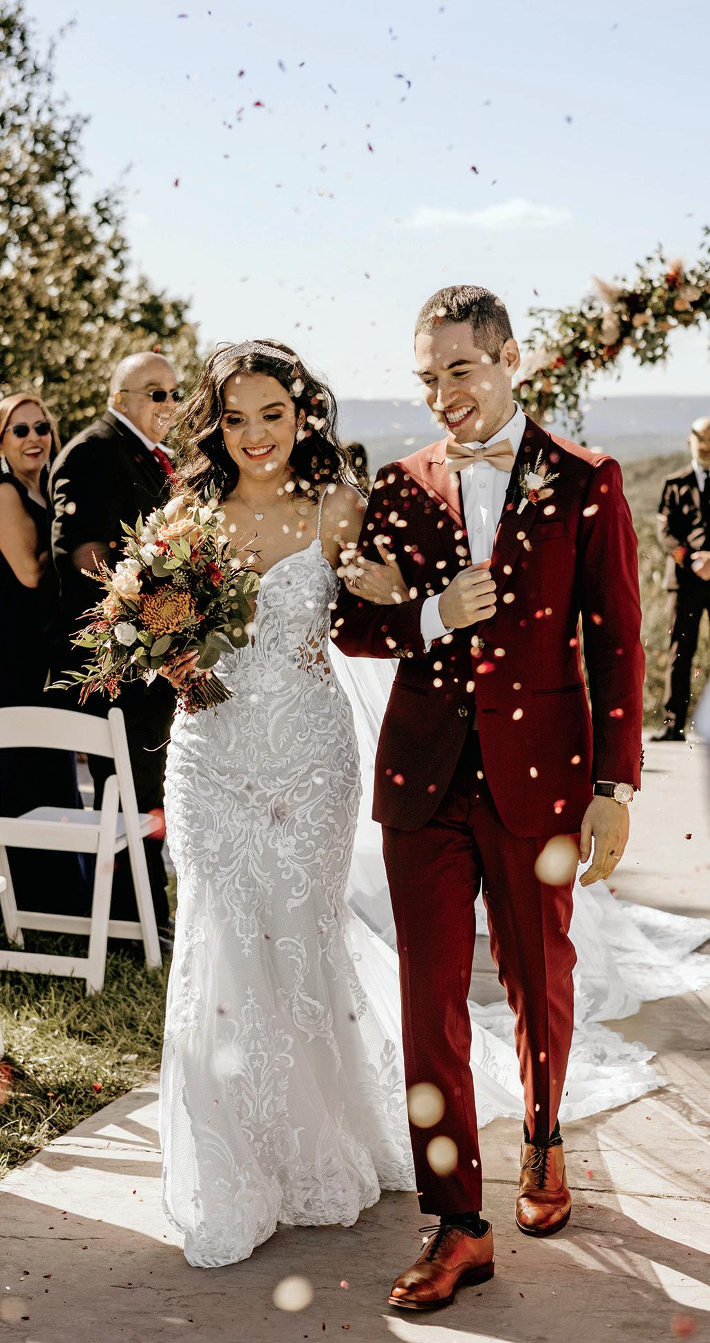After a heartwarming ceremony among the palm trees, the cocktail hour commenced and was a highlight for Angelica. Not only did the couple serve delicious fruit-forward signature drinks, but there was an out-ofthis-world sushi bar to dig into. In addition, the couple displayed vintage rotary phones as audio guest books, so people could verbally share their well-wishes. The party next moved under a sheer golden canopy with a terra-cotta-colored gable structure, where guests enjoyed a seven-piece band. But there was a surprise on the way: colorful hot air balloons suspended in the sky, a perfect backdrop for golden-hour pictures. They also gave Angelica and Jonathan some alone time, since they went up in one after their grand reception entrance.
