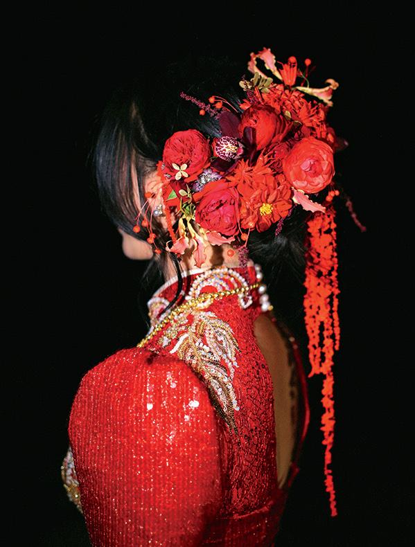 one for the ceremony and an all-red one for the reception to match her red qipao, a traditional form-fitting Chinese dress.
