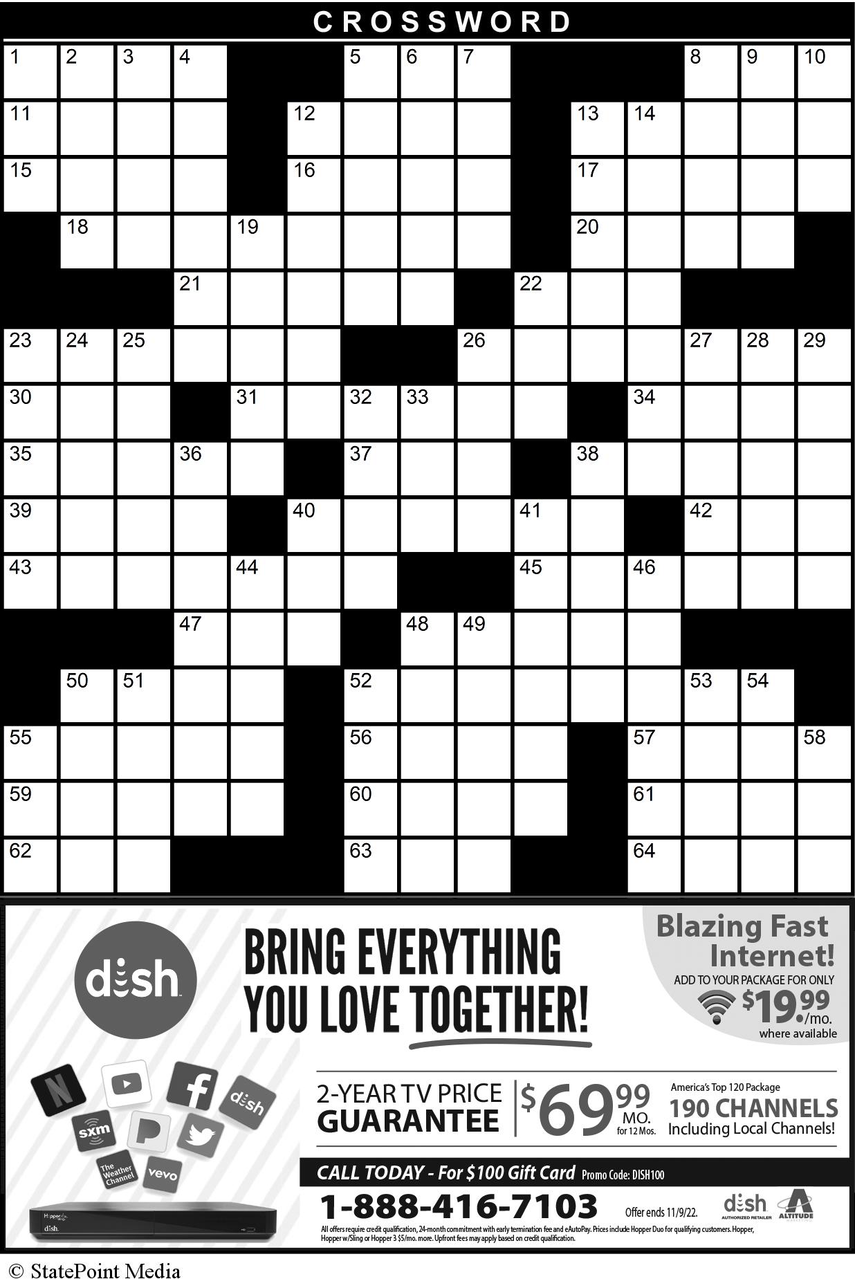 January 4, 2023 • LA FERIA NEWS • 7 THEME: WORLD CUISINE ACROSS 1. *Like popular Pad 5. Limit 8. Boozehound 11. Bring home the bacon 12. *Combine cuisines 13. Door holder 15. Between ports 16. *America's favorite cookie, according to some 17. Driver's 180 18. *Like poke bowl 20. Magician, in the olden days 21. Type of wrench 22. Campaigner, for short 23. Traditional sock pattern LAST WEEK’S SUDOKU ANSWERS LAST WEEK’S CROSSWORDS ANSWERS 40. *Soft and soft type of tofu 42. Ship pronoun 43. Thrusts out or causes to protrude 45. One way to steal gas 47. Without professional help, acr. 48. Energy to motion converter 50. H.S. math class 52. *Wasabi is popular in this cuisine 55. *Type of soda bread 56. g in 10 g 57. Francis Coppola's middle name 59. End of tunnel 60. Casanova, e.g. 61. In the thick of 62. Saturn's wife 63. Human limb 64. *Russian borscht vegetable DOWN 1. *Brew from China, originally 2. *American ____ browns 3. Acreage 4. Sort of (3 words) 5. Marie or Pierre, physicists 6. Southeast Asia org. 7. Lowly laborer 8. Like a bug in a rug 9. Princess Fiona, by night 10. Square root of 100 12. Thwarted 13. SNL's forté 14. *Nationality that gave us gelato 19. Administer 22. Wound fluid 23. Not dead 24. Radices, sing. 25. *Clarified butter of Indian origin, pl. 26. *Peking fowl 27. Mennonite's cousin 28. Jack Black's Libre 29. Martin of "Apocalypse Now" 32. Terrorist org. 33. Fat of olives 36. *Like certain meatballs 38. Tear-jerker 40. Hog heaven 41. Posthumous type of tax 44. Like 90 degree angle 46. Reassembled dwelling 48. Feudal dwelling 49. Poppy tears 50. Acid "journey" 51. Semis 52. France/Switzerland border mountain range 53. Not all 54. Canal in a song 55. U.N. workers' grp. 58. Banned insecticide, acr. 26. *Southeast Asian spiky fruit, pl. 30. ____-di-dah 31. Unequivocally detestable 34. Same as ayah 35. "That is," Latin 37. Urge Spot to attack 38. Chilled (2 words) 39. Observation point's attraction The Next Chapter Poem scan and visit!