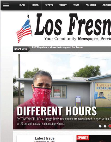 WEEK OF S E pt E mb E r 7, 2022 t H r OUGH SE pt E mb E r 13, 2022 LOOK INSIDE Classified pg 3 Sports pg 4 Puzzles pg 5 Activity Page pg 6 Volume 18 Number 36 www.losfresnosnews.net 705 W. HWY 100 Los Fresnos, Tx 78566 956-233-5744 AUTO • HOME • LIFE • COMMERCIAL • FLOOD • WIND RIO GRANDE UNDERWRITERS INSURANCE GROUP, INC Member FDIC The only Community Bank with locations in Cameron, Hidalgo and Willacy Counties Fishing for Low Rates... Boat owners insurance for less than you think. State Farm® boat insurance doesn’t cost much, but covers a lot – like your boat, motor, and trailer. It also protects you and your passengers. Do you have the proper coverage? FREE QUOTE This Space AVAILABLE CALL 956-264-7720 CULLIGAN WATER OF THE RIO GRANDE VALLEY better water pure and www.culsimple liganrgv.com CULLIGAN® WATER OF THE RIO GRANDE VALLEY better p d www.culp liganrgv com www.culliganr gv.com 1300 W. Business 77 • San Benito, TX 956-399-1780 Call today for a FREE water analysis! CULLIGAN® WATER OF THE RIO GRANDE V CULL Generic 5x2 eng_Layout 1 10/30/12 11:27 AM Page 1 CULLIGAN® WATER OF THE RIO GRANDE VAL better water pure and www.culsimple liganr gv com CULL Generic 5x2 eng_Layout 1 10/30/12 11:27 AM Page 1 Page 7 Page 5 Page 8 Poem: Collectors Page 4 Page 2 Teen-Scape Program a hit in Los Fresnos Sweep City Forensic Macro Photography at TSC Space Channel Launches at Texas Southmost College New Snack Shop is Soaring High