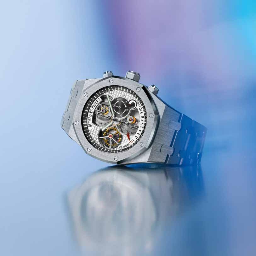 However, more than a return to the origins, the 2000s was before all characterised by cutting-edge de sign and micro-mechanics in tune with the new millennium. Both the Royal Oak Concept, launched in 2002,2 and the Royal Oak Tradi tion d’Excellence N°4 (2004) tes tify to the avant-garde and futur istic vibe of the early noughties. Debuted in 1999, the Tradition d’Excellence cross-collection se ries went beyond the framework of classical watchmaking by com bining complications innovatively. The Tradition d’Excellence N°4 (ref. 25969PT) couples a chronograph and a tourbillon in a 44 mm Roy al Oak platinum case. This limited edition of 20 pieces was endowed with a remarkable 10-day pow er reserve thanks to its pioneer ing double barrel, visible through the partially openworked dial. The avant-garde dial also incorporat ed two power-reserve indications (10 days and last 24 hours) in addi tion to the tourbillon cage and the chronograph’s minute counters.