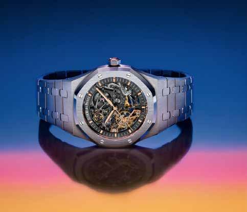This blend of refined aesthetics and technical mastery permeated throughout the decade, notably with the Royal Oak Double Bal ance Wheel Openworked launched in 2016. Conceived by Audemars Piguet watchmakers, the patented mechanism it houses improves a watch’s precision and stability. By incorporating two balance wheels and two hairsprings assembled on the same axis, the system oscil lates in perfect synchrony. Visible on both sides of the case, the dou ble balance wheel also confers a rare glimpse of the watch’s beating heart. This timepiece, first released in a 41 mm steel or pink gold case, has since been reinterpreted in an additional 37 mm size as well as in