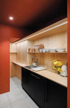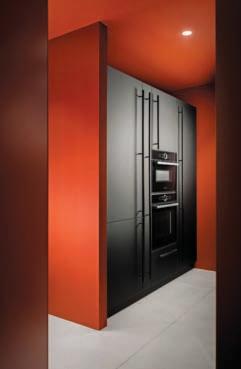 Colour defines the separate zones throughout Niche. In the kitchen area, sleek black appliances from Oxford House are offset by the vermillion of the partitioning.