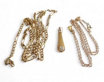 346 Description An Edwardian gold, peridot and seed pearl bar brooch Tests as 15ct with lower ct pin, length 43mm, 2.66g and 2 other bar brooches, one gilded metal, the other an RAF badge with blue and red detail, stamped ‘STERLING’, length 37mm