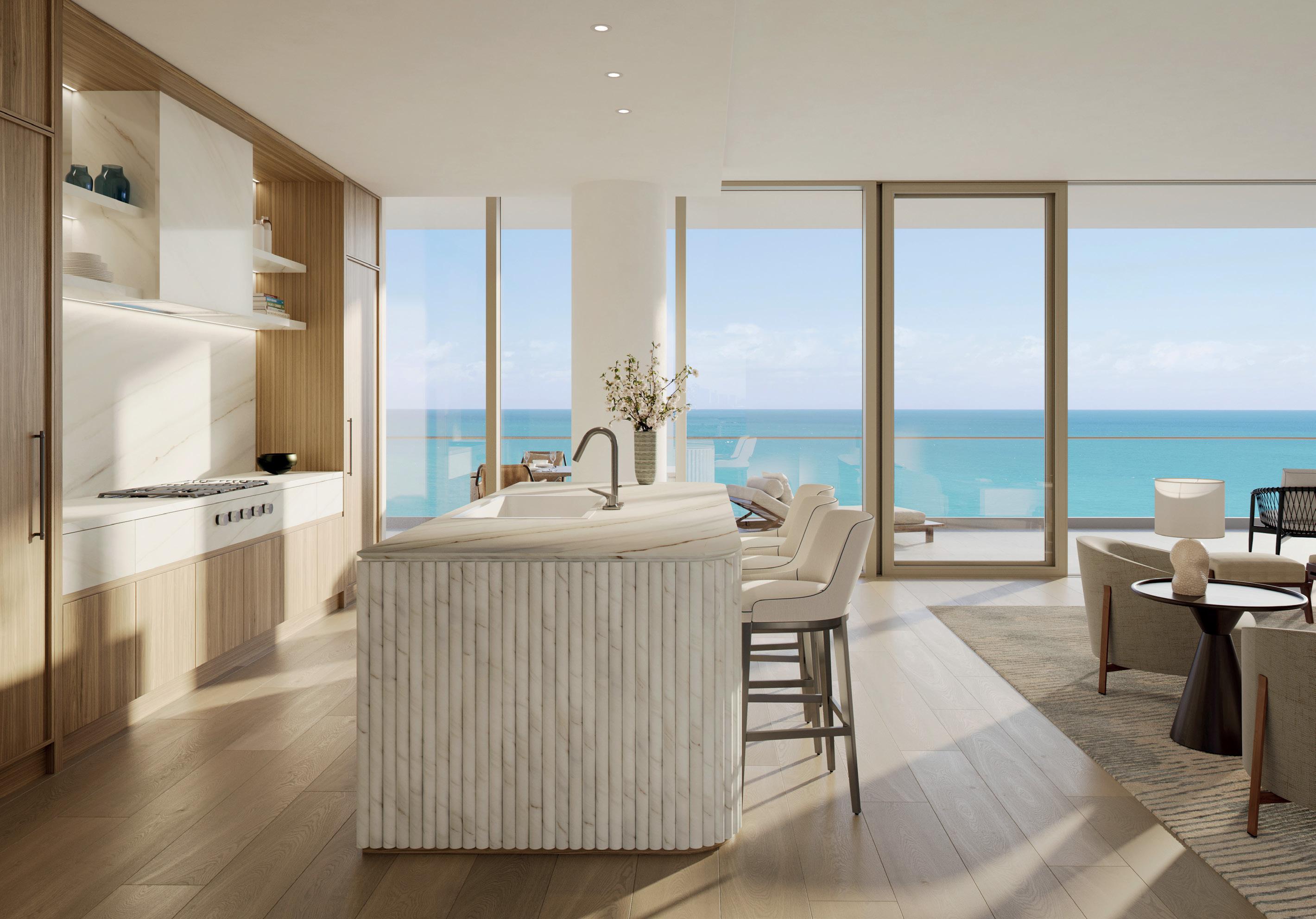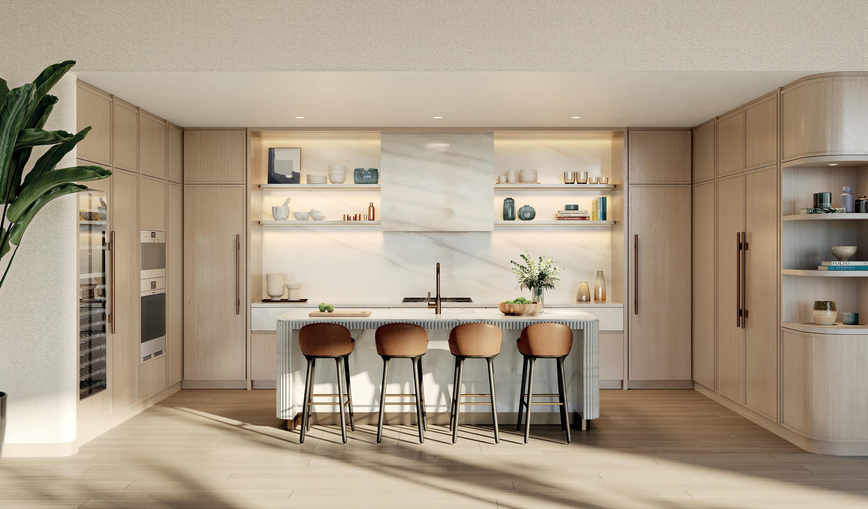 Envisioned for best-in-class cuisine curation and designed for refined luxury, kitchens boast custom fluted and honed Bianco marble, a suite of Sub-Zero Wolf appliances, and custom Tara