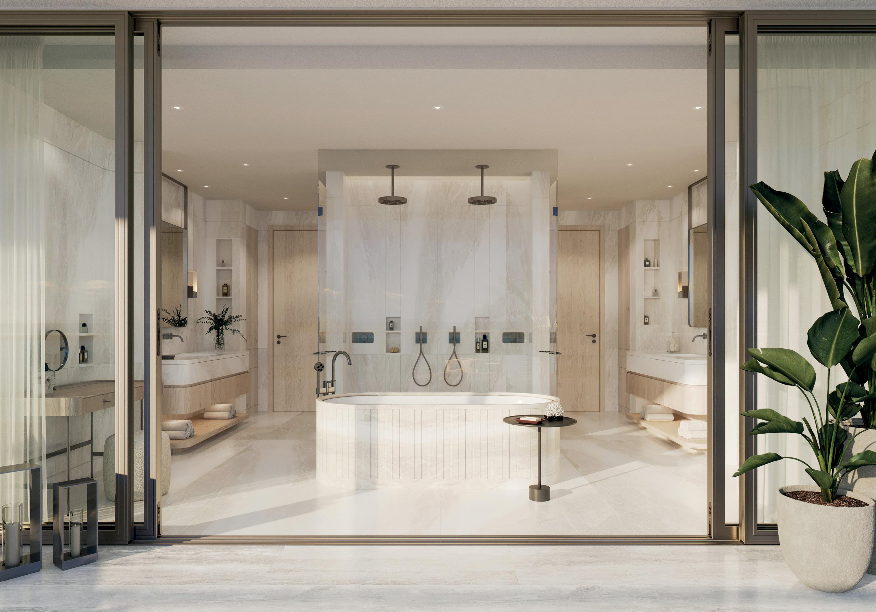 Each residence boasts its own private elevator entrance from which airy, open-plan living areas flow toward the all-encompassing views. These panoramas, whether the endless blue of the Atlantic Ocean or the coastfringed azure waters of Biscayne Bay, are framed by 10-foot-high ceilings, floor-to-ceiling windows, and expansive private terraces.