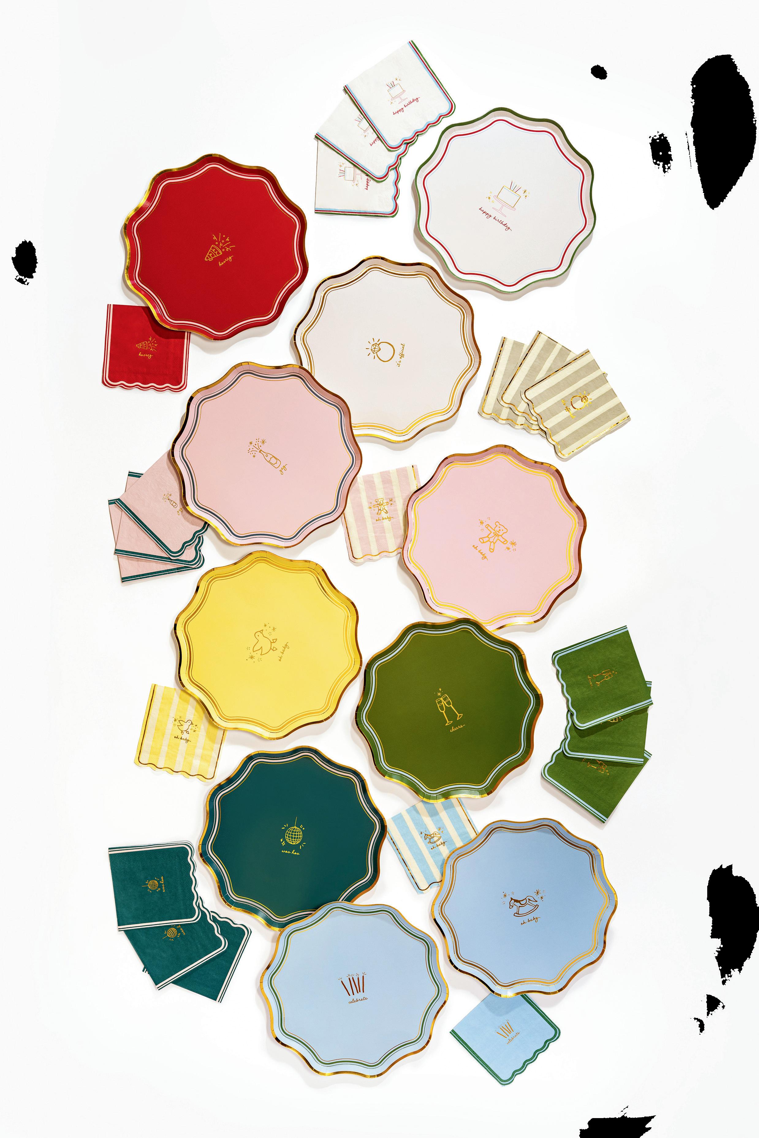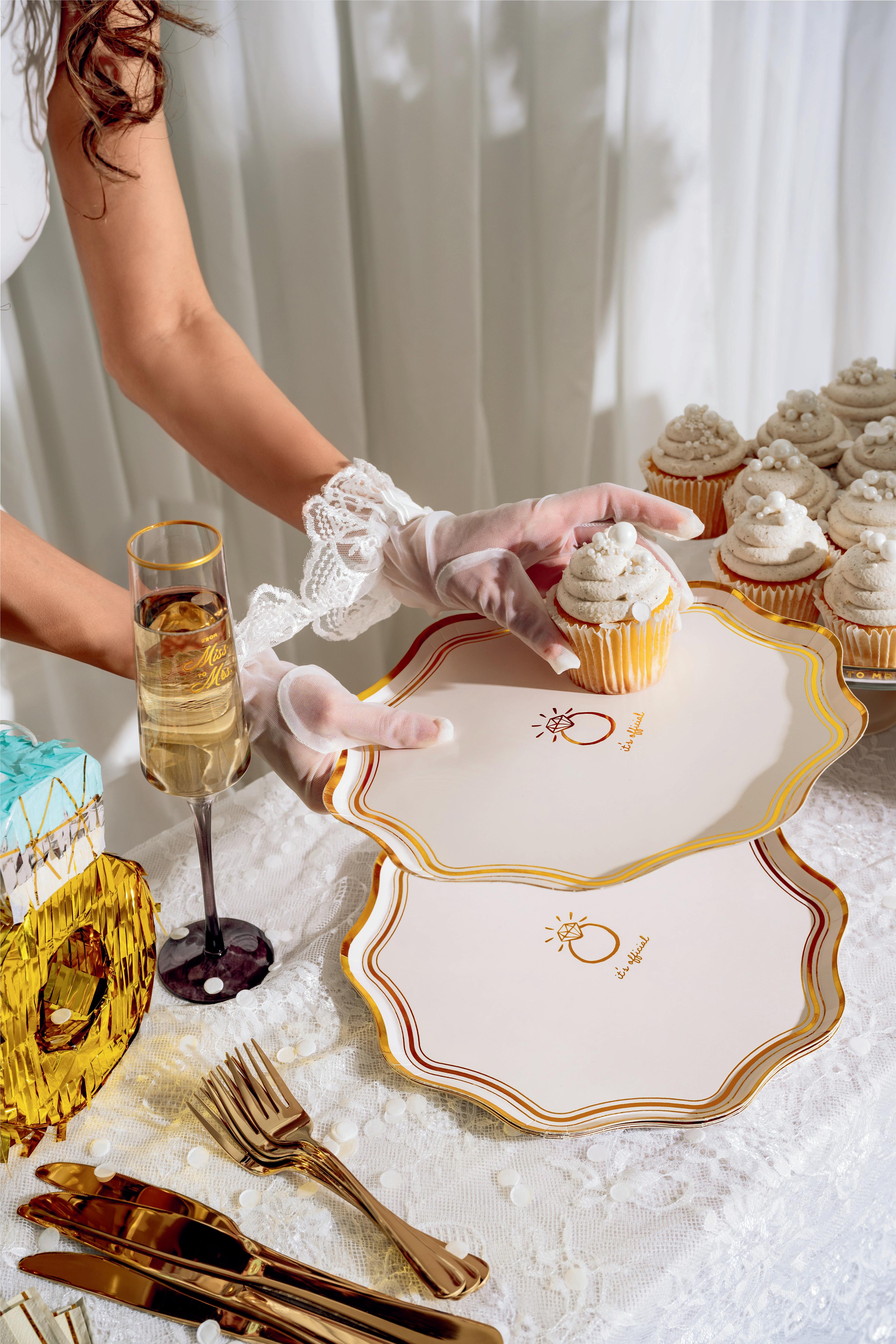 10.5" disposable paper plates with gold foil accents & scalloped edges.