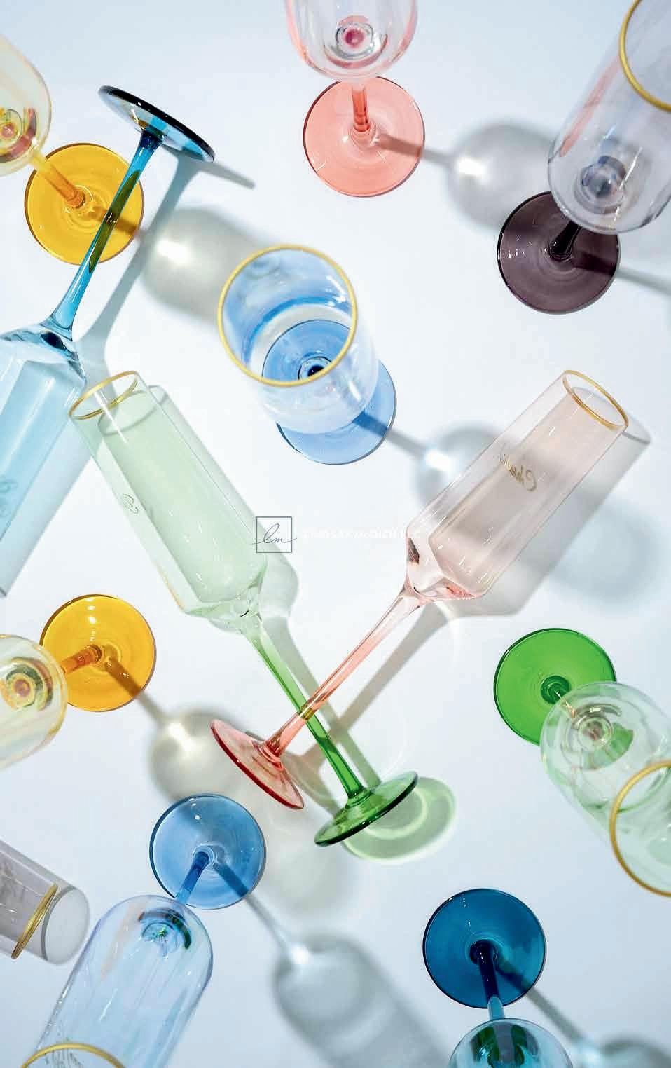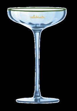 6 oz. colorful lead-free crystal coupe glass with contrasting rim & gold accents. Hand wash only.