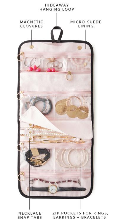 Crafted in a tri-fold design for portability, the Jewelry Organizer is lined with a luxurious micro-suede to protect your most valued keepsakes. Fully visable transparent compartments offer spacious solutions for your collection while a hideaway loop closure allows you to hang your organizer at length for accessorizing ease.