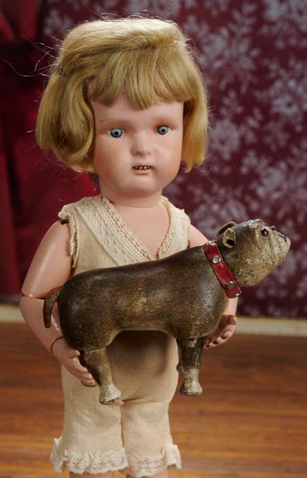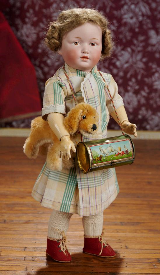 (body). Comments: Kestner, circa 1910. Value Points: wonderfully expressive face of the art character model with choicest bisque and painting, original body and body finish, antique cotton school dress and carrying little mohair Steiff pup and German tin lithographed lunch pail. $1700/2100