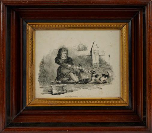 15” (38 cm.) x 13”. The etching depicts a child and her dog having a tug-of-war over her favorite doll, signed by the artist Francis and dated 1832, presented in Victorian frame with ebony and gilt centers. Excellent condition. Circa 1832. $200/300