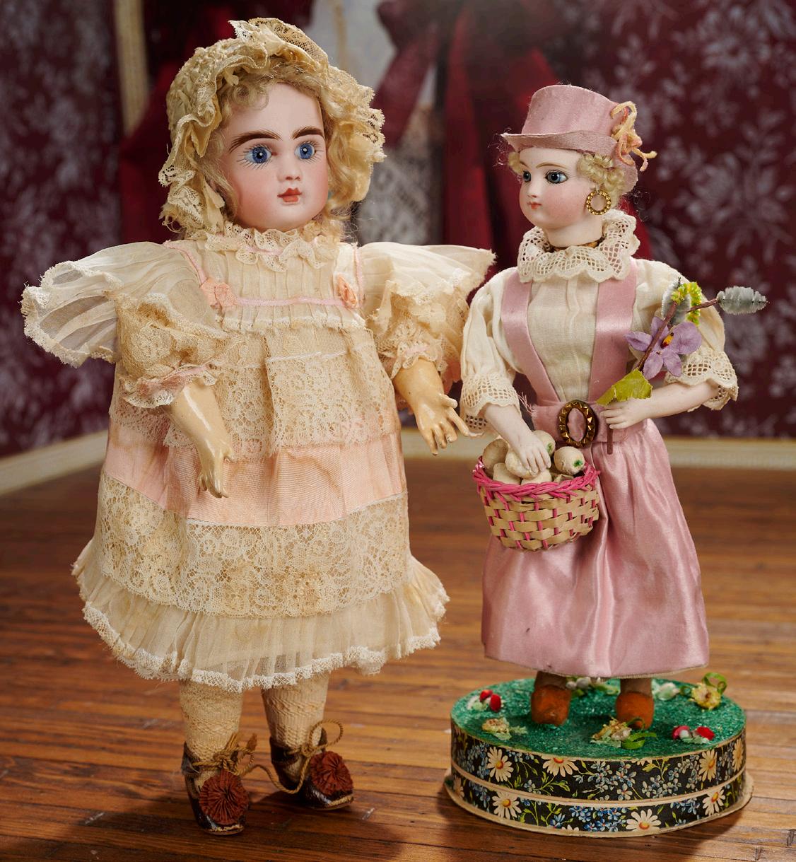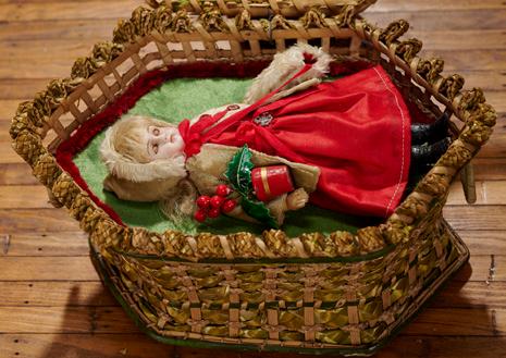 13” (33 cm.) Bisque socket head, blue glass inset eyes, dark eyeliner, painted lashes and brows, accented nostrils, closed mouth, blonde mohair wig, attached to hollow carton torso which separates at the center for use as candy container, wooden arms with shoulder and elbow jointing, wooden lower legs, painted socks, wearing antique costume, apron, and carrying original wicker basket designed to hold additional candies. Condition: generally excellent. Marks: 59 2/0.