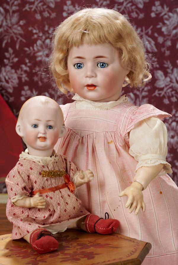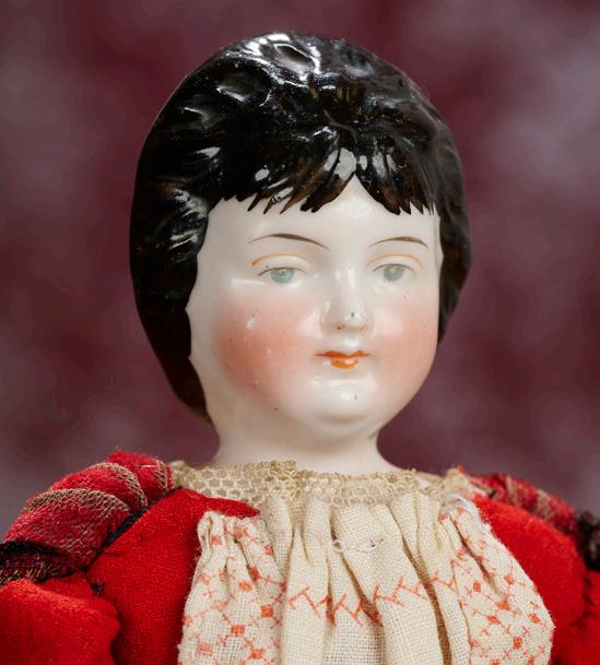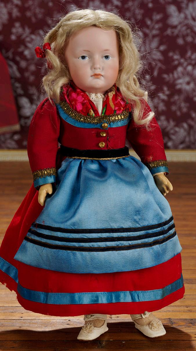 8 ½” (22 cm.) Bisque swivel head on kid-edged bisque torso, very plump cheeks, blue glass spiral-threaded eyes with darker blue iris rims, rose blushed eye shadow, feathered brows, accented nostrils and eye corners, slightly-parted outlined lips, two square-cut upper teeth and one lower, blonde mohair wig over plaster pate, peg-jointed bisque arms and legs, modeled bent elbows, shapely legs with bare feet, nicely costumed. Condition: generally excellent. Marks: 102 12. Comments: Germany, circa 1880, the doll is known as “French Wrestler” in reference to its muscular modeling of body.