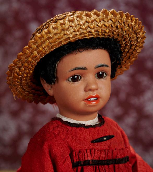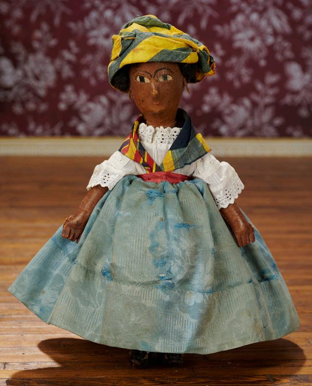 10” (25 cm.) Firmly-stuffed all-brown leather doll has stitched-on leather cover over muslin form, shaped facial features including nose, chin and tiny mouth, defined neck, cut-out eye sockets with applied pupils, painted brows, black wiry hair, hand-stitched leather body. Condition: generally excellent. Comments: for the French market, late-19th century, the doll was designed to represent native women of the French Martinique Islands. An article about the dolls appeared in the French journal L’Illustration at that time. Value Points: wearing white cotton cutwork blouse, matching petticoat under blue silk skirt with demitrain, leather shoes, silk shawl and turban. $400/500
