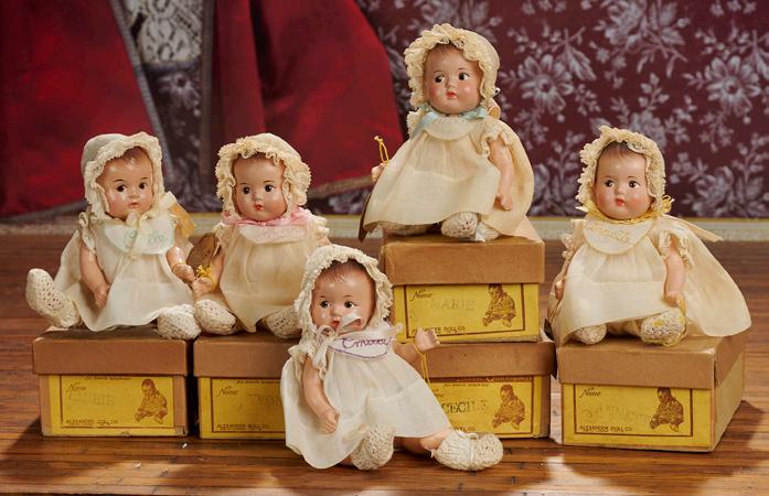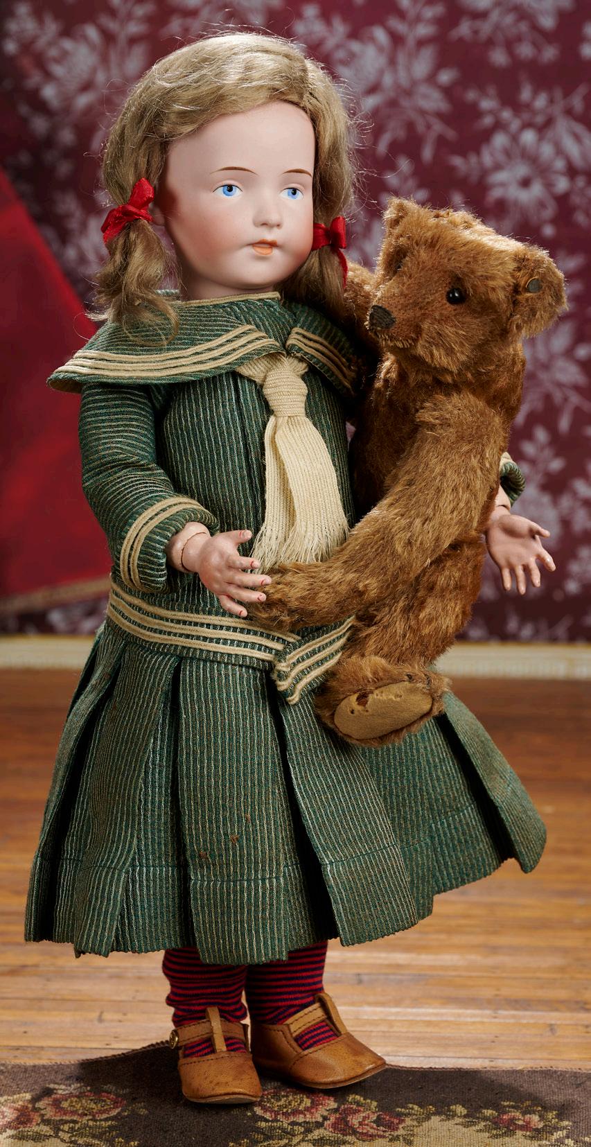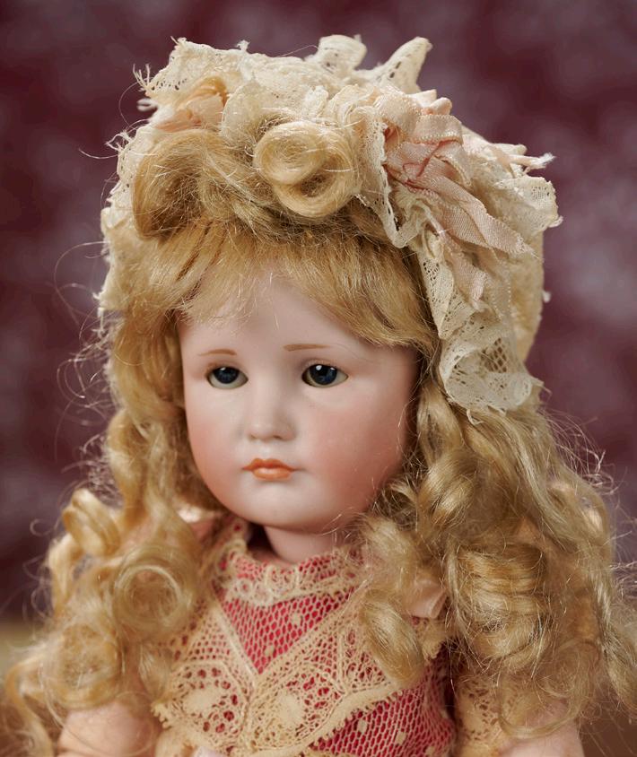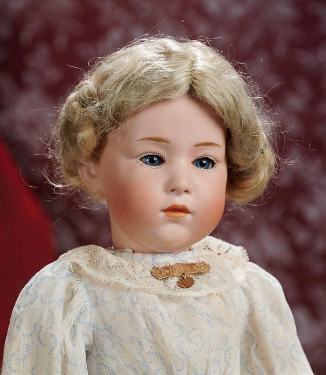 19” (48 cm.) Bisque socket head, small blue glass sleep eyes, painted curly lashes, arched lightly-feathered brows, accented nostrils, closed mouth with downcast pouting expression, very plump cheeks and chin, blonde mohair wig, composition and wooden fully-jointed toddler body with well-detailed muscular and chubby shape. Condition: generally excellent. Marks: 231 Fany DRGM 248/1 A 5 M. Comments: Marseille, circa 1912. Value Points: rarely found model from this firm, its rarity rivaled by outstanding sculpting and quality of bisque, original body and body finish, wonderful antique costume. $2800/3500