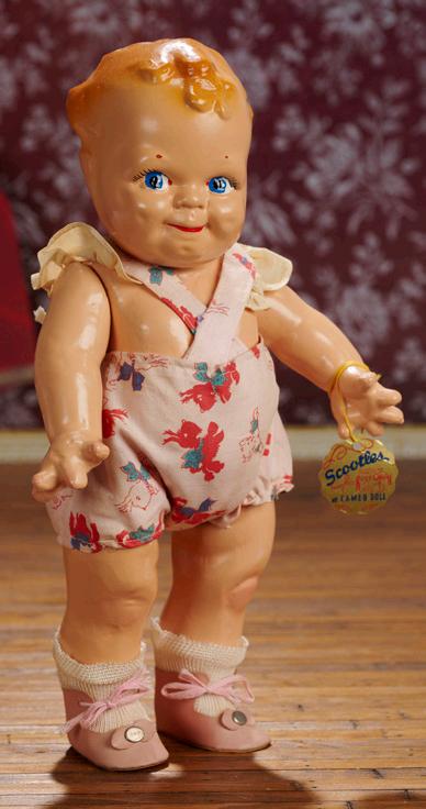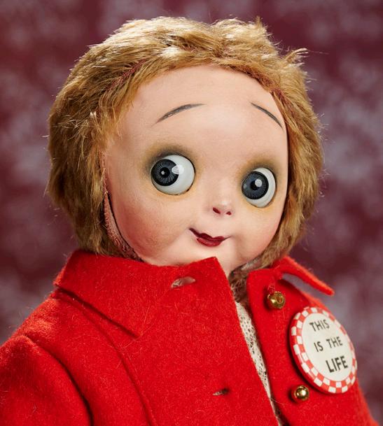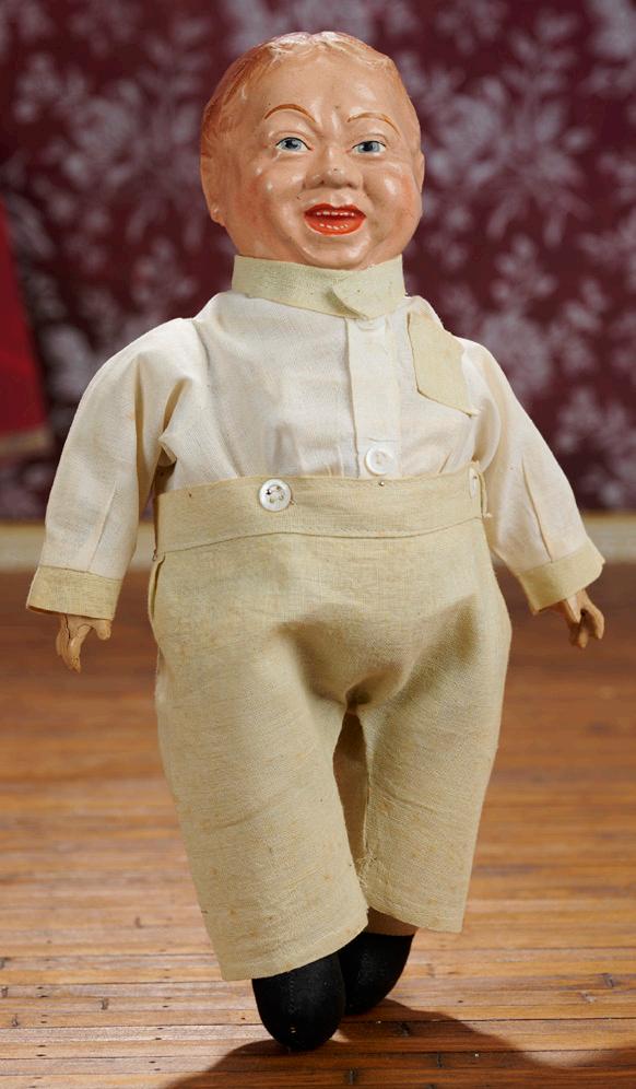 14” (36 cm.) Composition head with distinctively sculpted facial features and hair that exactly captures the appearance and personality of the early silent film actor, center-parted neatly-combed sculpted hair, high arched brows, deeply set painted eyes, strong nose, closed mouth in laughing expression with two rows of beaded teeth, impressed dimples, plump muslin body with short limbs, sewn-on black shoes, composition hands. Condition: generally excellent. Marks: John Bunny Doll Copyright L.A. & S 1914 Made exclusively by Louis Amberg & Son, N.Y. with the consent of John Bunny, the famous Moving Picture hero of the Vitagraph Co. (cloth label on costume). Comments: Amberg, circa 1914. Value Points: rare and superbly sculpted doll with well-preserved condition and costume. $500/700