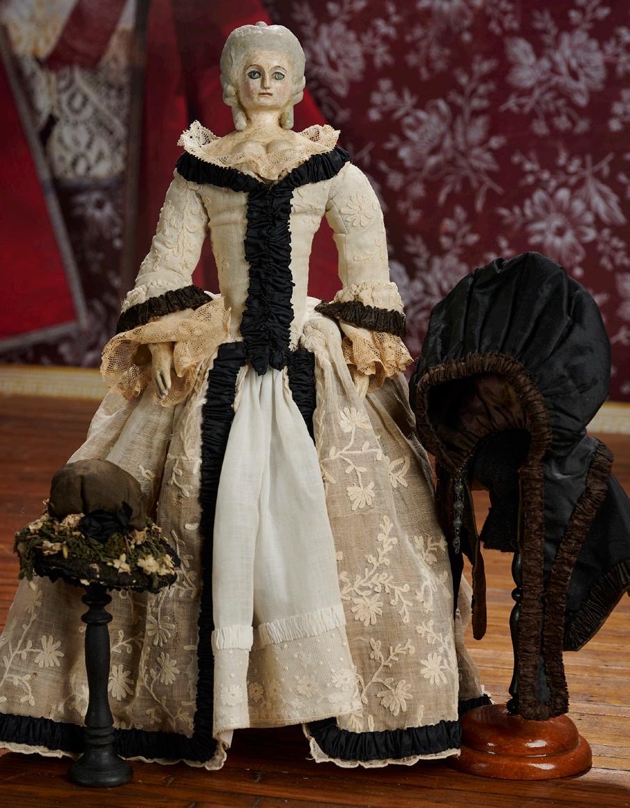 13” (33 cm.) Paper mache shoulderhead of lady, oval face with elongated throat, black centerparted hair looped low under her ears and drawn into a narrow braid that forms a chignon at the of head, painted blue eyes, black upper eyeliner and single-stroke brows, closed mouth with primly set lips, slender kid body with wooden lower arms and legs, painted yellow shoes, antique costume. Condition: generally excellent. Comments: Germany, circa 1855. Value Points: rare coiffure with welldetailed braids, original body.