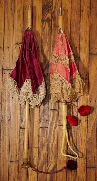 11” (28 cm.) Including wooden handled parasol with tasseled gilt tip and burgundy silk cover with lace edging; and faux-bone handled parasol with rose silk and lace cover. Very good condition, some silk frailty. French, circa 1885. $300/400
