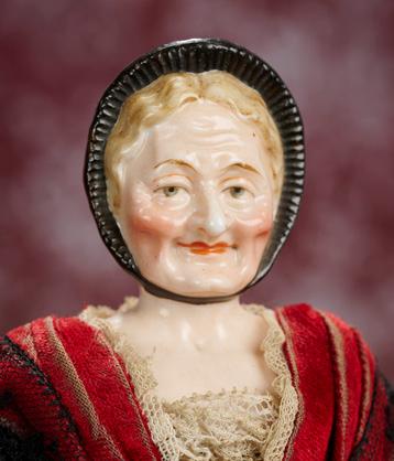12” (30 cm.) Pink tinted porcelain shoulderplate with two variations of face, each with sculpted hair that is separated by a wide bonnet brim, one face with deeply incised wrinkles and gaunt cheeks, smiling expression, inset blue eyes, jutting chin and nose; and the alternate face with dainty blue eyes and delicate cheek blush, black sculpted hair; on muslin body and porcelain lower limbs, each doll face with variation of costume. Condition: generally excellent. Comments: Germany, circa 1885, the doll was designed to symbolize the various ages of women. Value Points: rare model with excellent attention to age depictions. $1100/1300