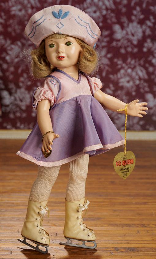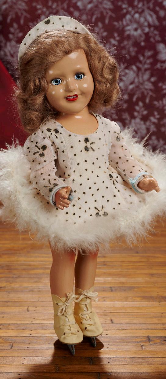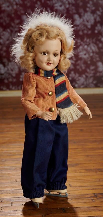 open mouth, rich lips, row of teeth, brunette mohair wig, jointing at shoulders and hips. Condition: very good. Comments: celebrity doll portraying the Canadian skater, Barbara Ann Scott, Reliable Dolls, circa 1940. Value Points: the doll is wearing her original spangled skating costume and cap, skates, and is preserved in original (worn) box base; included is Life Magazine of 1950 depicting on the cover a young girl skating with a Barbara Ann Scott doll in her arms. $300/400