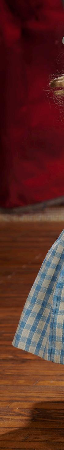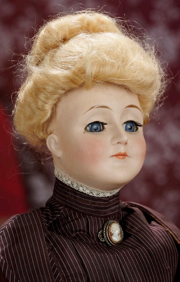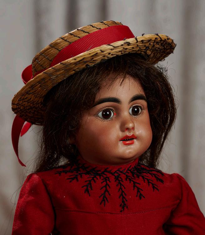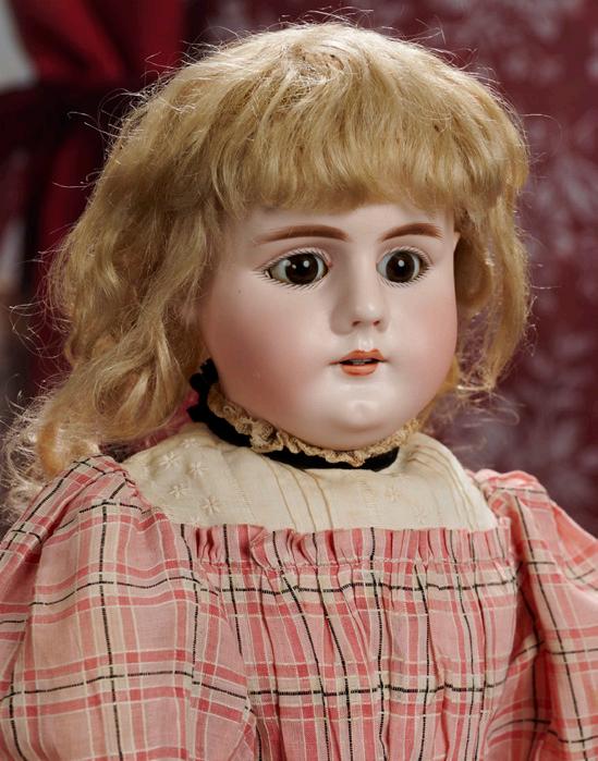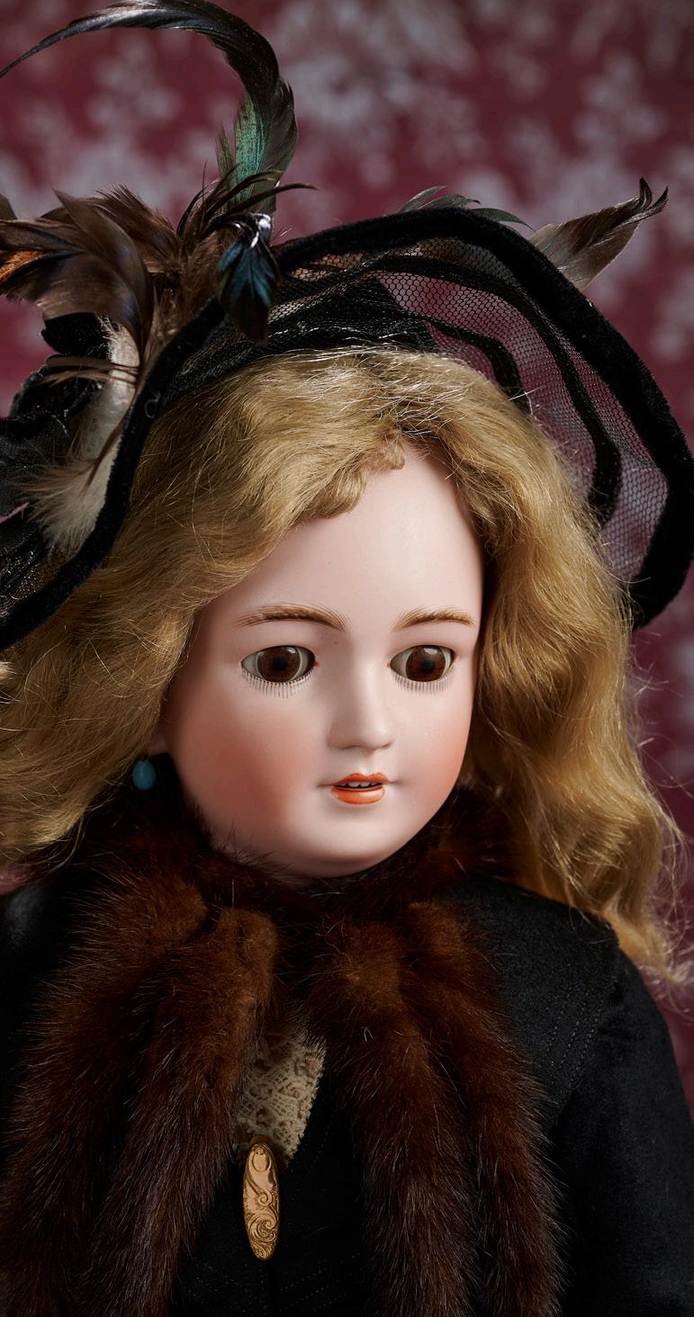 20” (51 cm.) Bisque socket head, large brown glass paperweight inset eyes, dark eyeliner, painted lashes, rich mauve shaded eye shadow, brushstroked feathered brows, accented nostrils and eye corners, closed mouth, defined space between the shaded and outlined lips, defined philtrum and chin dimple, separatelymodeled pierced ears, blonde lambswool wig over cork pate, composition and wooden eight-loose-ball-jointed body with straight wrists. Condition: generally excellent. Marks: 9 (head) Jumeau Medaille d’Or Paris (body). Comments: Emile Jumeau, circa 1878. Value Points: finest quality of bisque, complexion and painting, dramatic large eyes, original wig, body and body finish, early costume includes burgundy silk dress, with matching parasol and cap, undergarments, leather shoes. Ex-collection Lorna Lieberman. $6000/8000