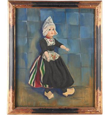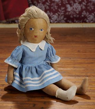19” (48 cm.) All-cloth doll with stiffened oil-painted facial features and brown hair in short bobbed fashion, painted large blue eyes with black outlined and thickly-painted upper lashes, single-stroke brows, accented nostrils, closed mouth, muslin stitch-jointed body with oil-painted hands and painted coral shoes, antique costume. Condition: generally excellent, some light craquelure and rubs.