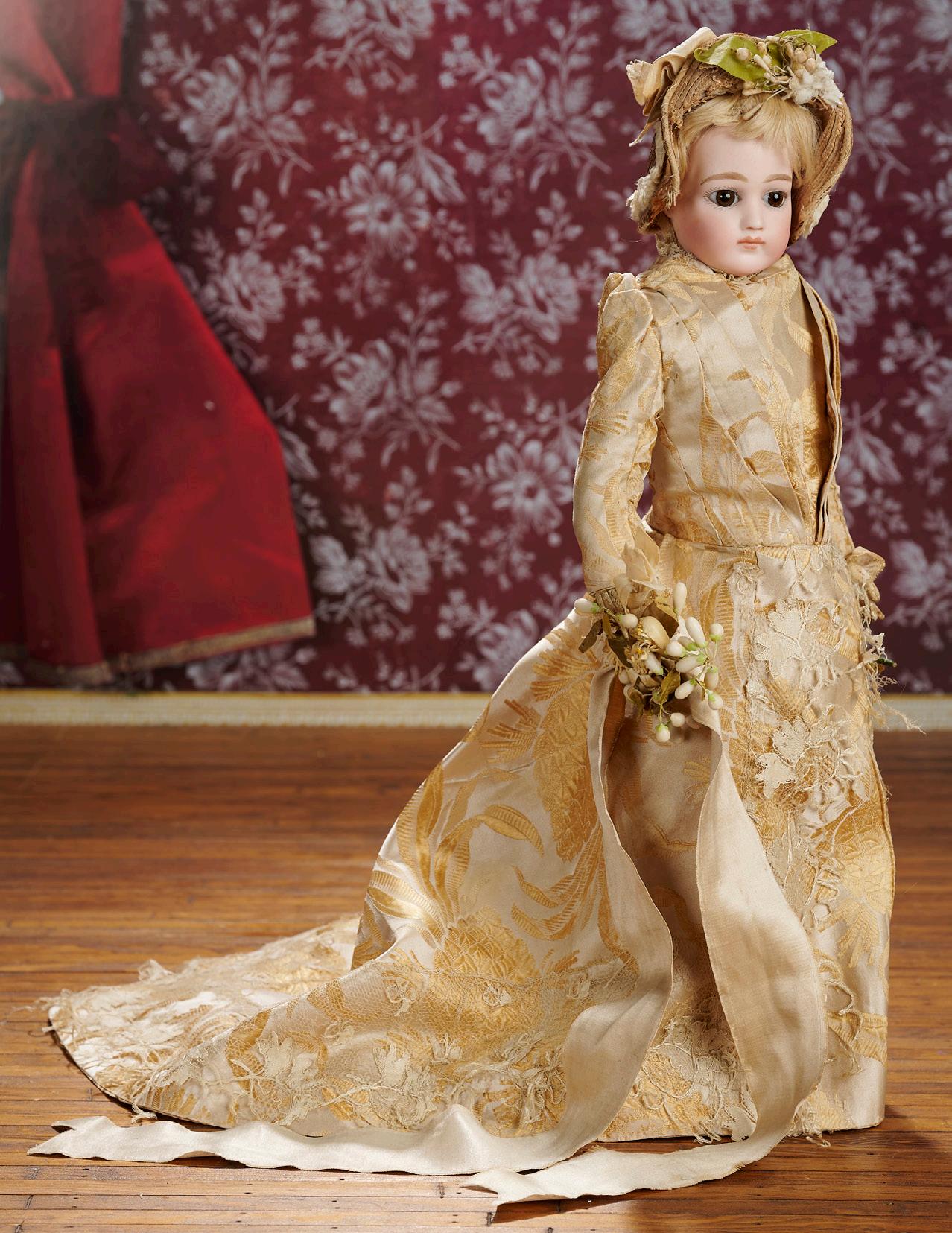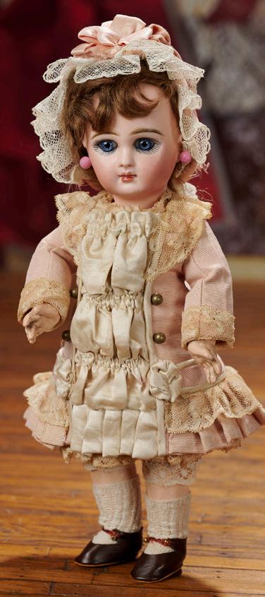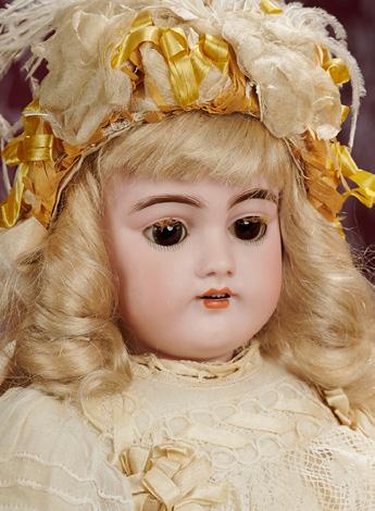 20” (51 cm.) Bisque socket head, very deep brown glass paperweight eyes with spiral threading, thick dark eyeliner, dark mauve eye shadow, painted lashes, brushstroked brows, accented nostrils, closed mouth with outlined heart-shaped upper lip, dimpled chin, separately-modeled pierced ears, blonde mohair wig over pate, French composition and wooden fully-jointed body with straight wrists. Condition: generally excellent. Marks: Depose E.9 J. (and artist checkmarks, head) Jumeau Medaille d’Or Paris (body). Comments: Emile Jumeau, circa 1885. Value Points: stunningly beautiful with richly-decorated eyes, original wig, body, body finish, and wearing original costume of the Ernestine Jumeau studios, comprising ivory cashmere flannel dress with attached cape edged in fine cutwork and attached underskirt of muslin pleats, gold featherstitching, pearl buttons, elaborate matching bonnet, undergarments, Jumeau socks, Jumeau ivory satin shoes with gilt E. Jumeau lettering, brass brooch, blue Jumeau earrings, and original Jumeau chemise. The doll is shown in The Jumeau Book by Theimer/ Theriault, page 410. $5500/7500