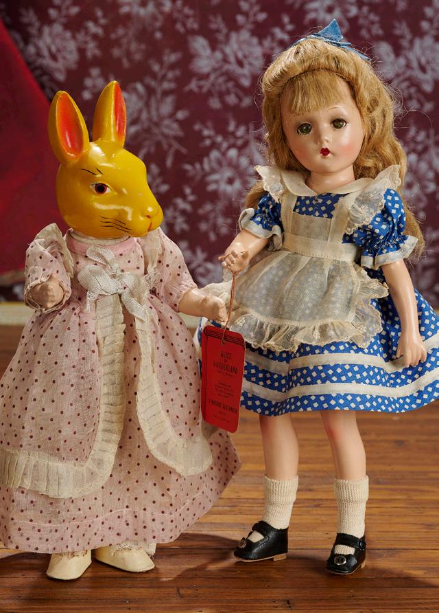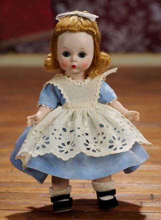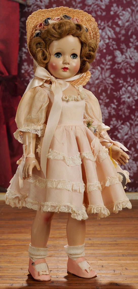 14” (36 cm.) All-composition with socket head, sleep eyes, real lashes, dark eye shadow, open mouth, four tiny teeth, impressed cheek dimples, ash-blonde human hair with original coiffure of arranged curls decorated with colorful flowers, jointing at shoulders and hips. Condition: generally excellent, eyes slightly faded. Marks: “Genuine Sonja Henie Doll/Madame Alexander NY USA/ All Rights Reserved” (tag on costume).