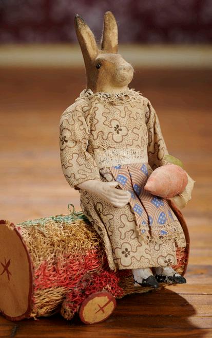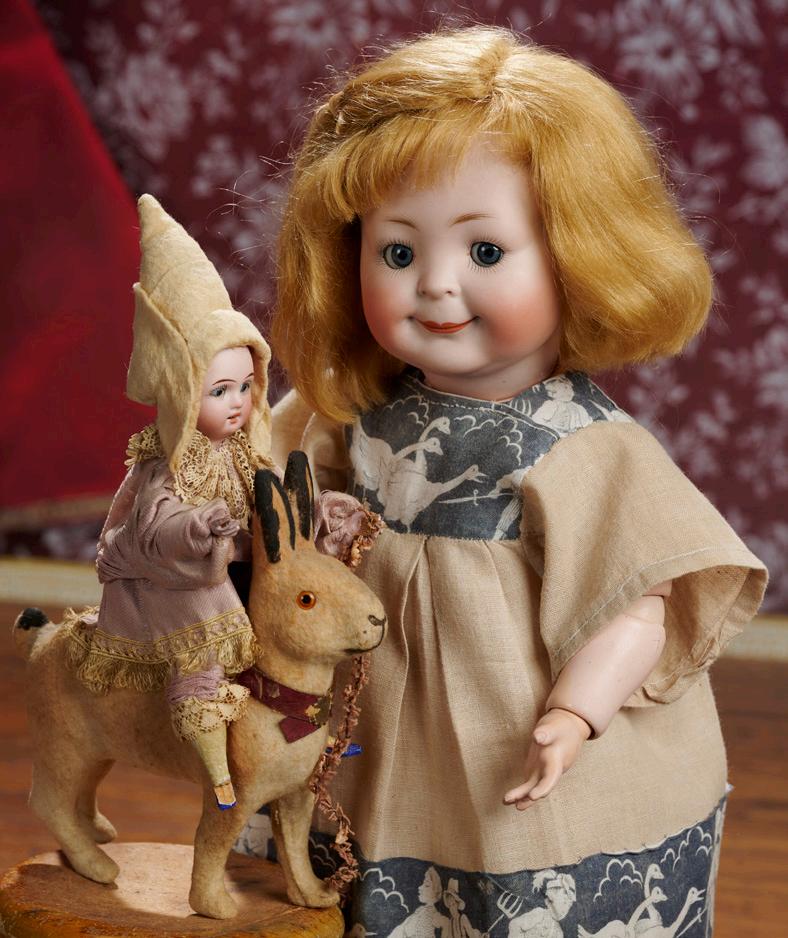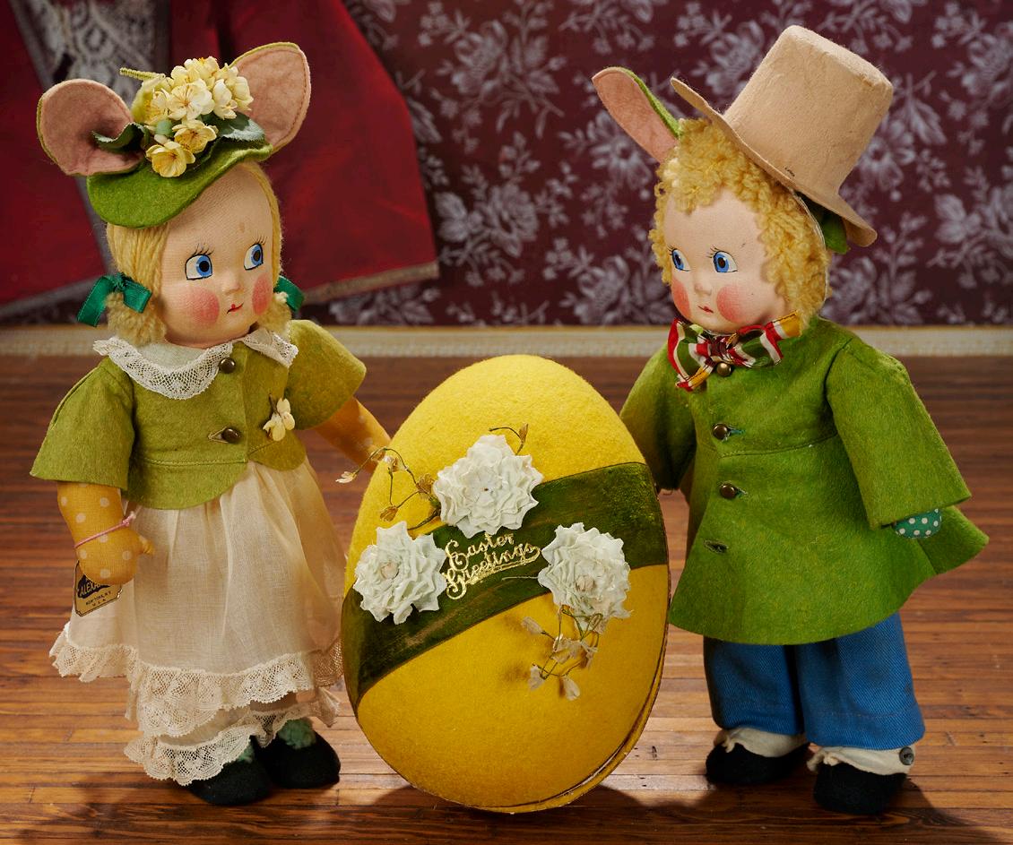 13” (33 cm.) h. 11”l. Seated astride a paper mache bunny with flocked finish, amber glass eyes, bunny ears, and removable head for access to candy container body, is a bisque head boy with blue glass eyes, open mouth, mohair wig, wooden block torso, composition lower legs, bisque hands, wearing original costume comprising blue silk pants and matching top hat with leaf decorations, Springtime bouquet in hand. Condition: generally excellent, tiny chip on inside fingers of right hand. Comments: Germany, circa 1900. Value Points: wonderfully preserved large luxury candy container presentation.