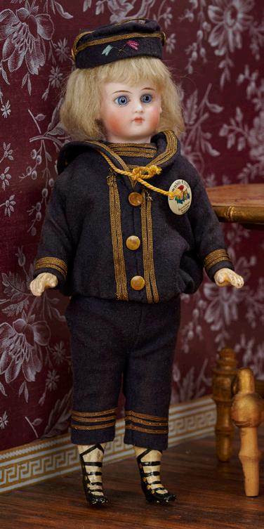 7” (18 cm.) Bisque socket head, painted facial features, blue eyes, black upper eyeliner, single-stroke brows, closed mouth with pouting expression, blonde mohair wig, five-piece paper mache body with painted shoes and socks. Condition: generally excellent. Marks: K*R 114 19. Comments: Kammer and Reinhardt, circa 1912, from the firm’s artist character series. Value Points: wonderful state of preservation, including lush blonde mohair wig, original body and body finish, mariner costume and hat. $400/600