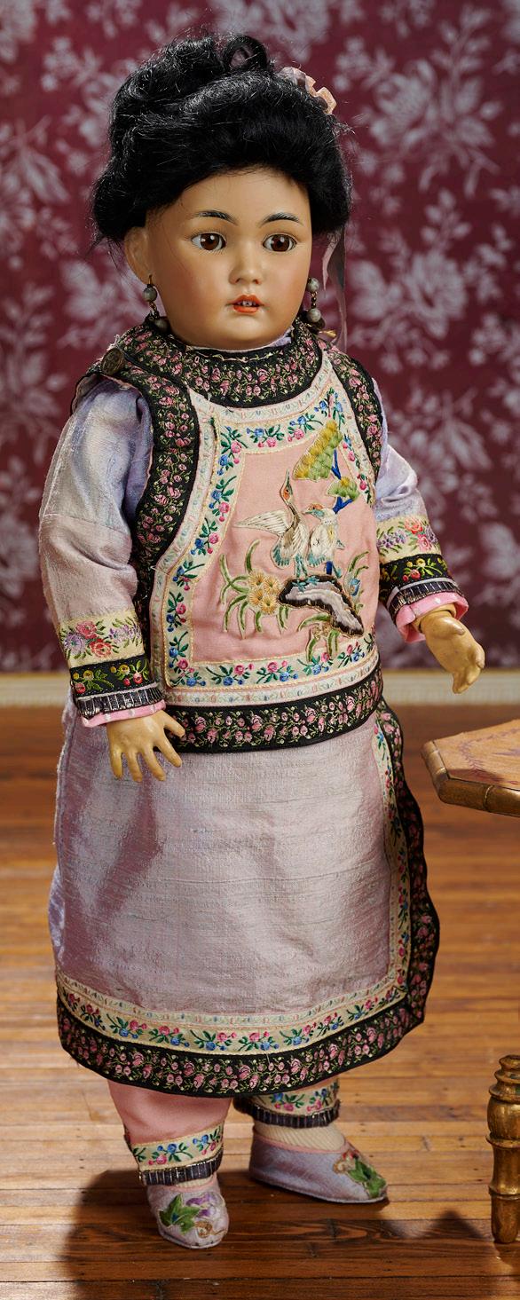 20” (51 cm.) Amber-complexioned bisque socket head, small brown glass sleep eyes, dark eyeliner, painted lashes, one-stroke black brows, slightly-parted lips, four porcelain teeth, pierced ears, black mohair wig in up-swept fashion, composition and wooden ball-jointed body. Condition: generally excellent. Marks: 500 BSW. Comments: Bruno Schmidt, circa 1900. Value Points: rare model with lovely complexion, original wig, wearing elaborate antique silk costume with gilt thread and embroidered floral costume, including slippers. Ex-Huguette Clark Collection. $900/1300