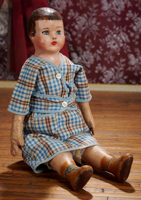 17” (43 cm.) Composition socket head with painted orange hair, large blue side-glancing eyes, dark eye shadow, long pointy red-tipped nose, closed smiling mouth, wooden body with jointing at hips, knees, and shoulders, painted black shoes. Condition: generally excellent. Marks: Original Pinocchio as Portrayed by C. Collodi, manufactured by Ralph Freundlich. Comments: Freundlich, circa 1930. Value Points: rare model with fine original finish, original costume and label. $300/400