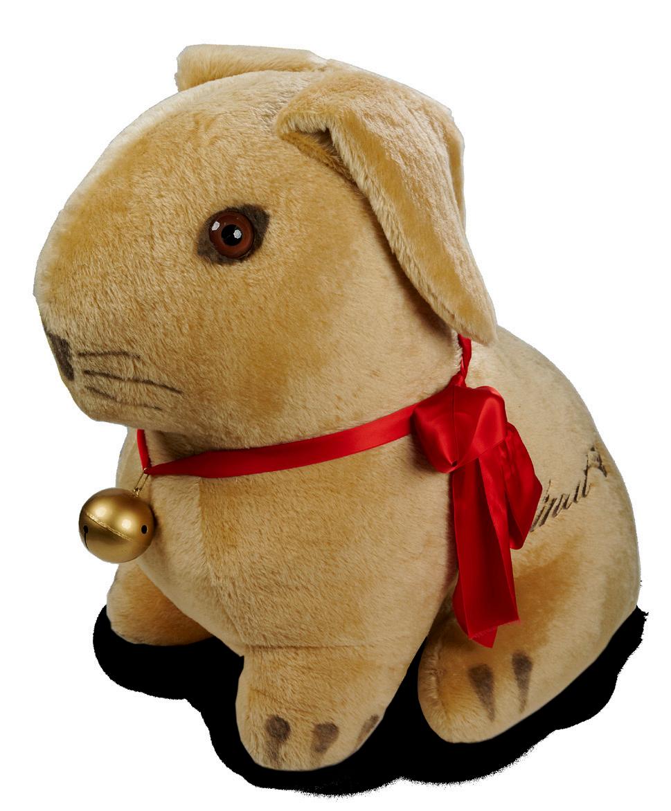 31” (79 cm.) Golden mohair bunny posed seated on back haunches has over-size brown eyes, handpainted details, and the name “Lindt” embroidered prominently on one side. With original over-sized Steiff button and yellow tag in ear. Excellent condition. Germany, late 1900s, the presentation of stuffed bunnies was a long-traditioned custom with Lindt chocolatiers, including bunnies from