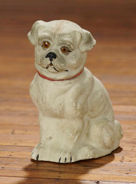 6” (15 cm.) All carved wood with applied composition face front with defined bulldog wrinkles, glass eyes, black nose and shaped lips, jointed neck under leather collar, leather ears and tail. Excellent condition. American, Schoenhut, circa 1905, the first version of the Schoenhut bulldog. $700/1100