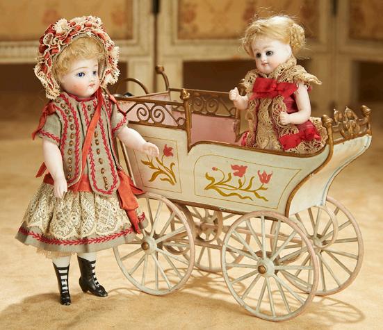 Collectors refer to little dolls by many different names. Mignonettes, miniature dolls, dolls that fit in the palm of the hand, and dolls 12” or smaller, are just a few of the names. The Kralovetz collection includes the rarest of the rare There are all-bisque French mignonettes, whimsical bisque character dolls, and the so-very-rare tiny sizes of the classic French bébés with kid or composition bodies from makers including Bru, Thuillier, Gaultier, Steiner and Jumeau. They range in size from 2”-12” and are
