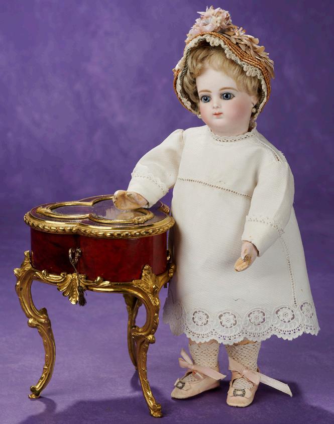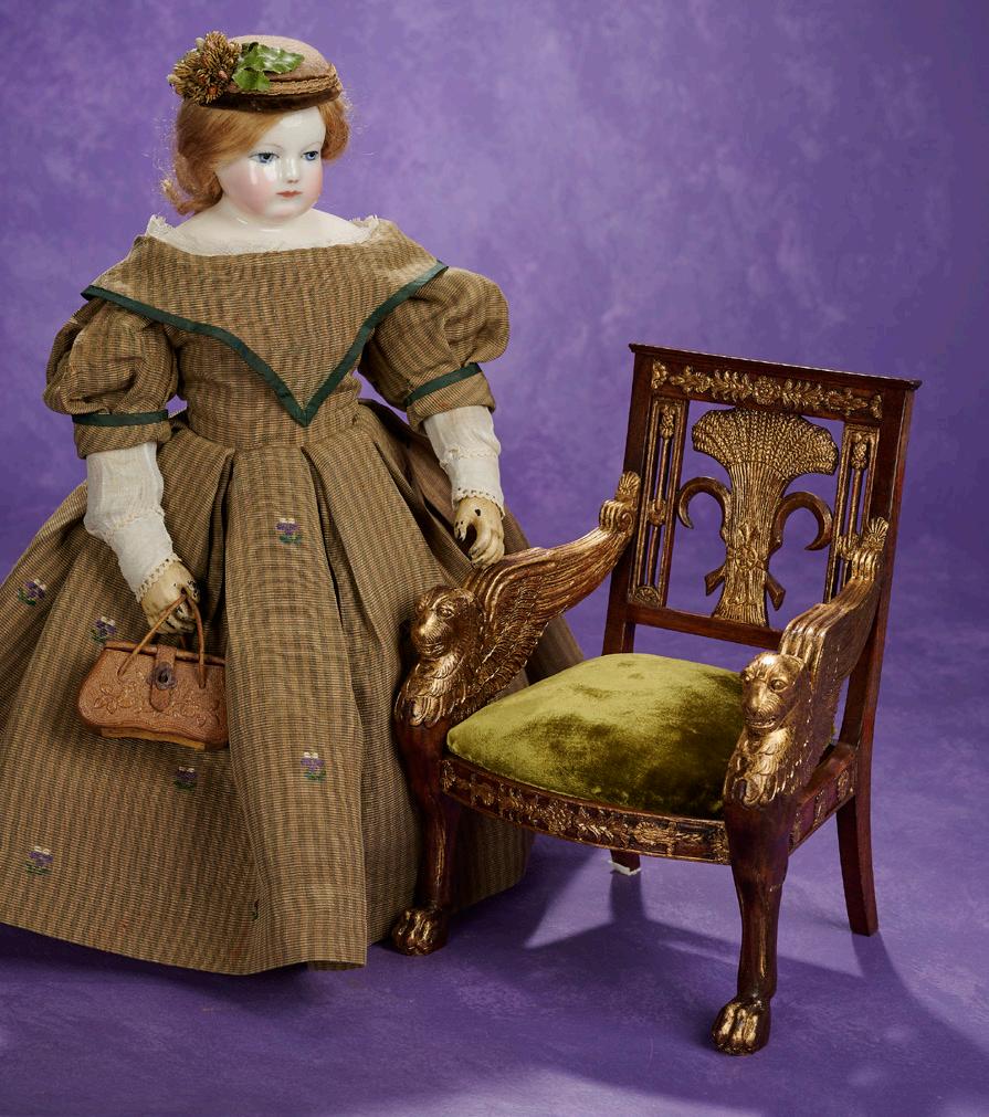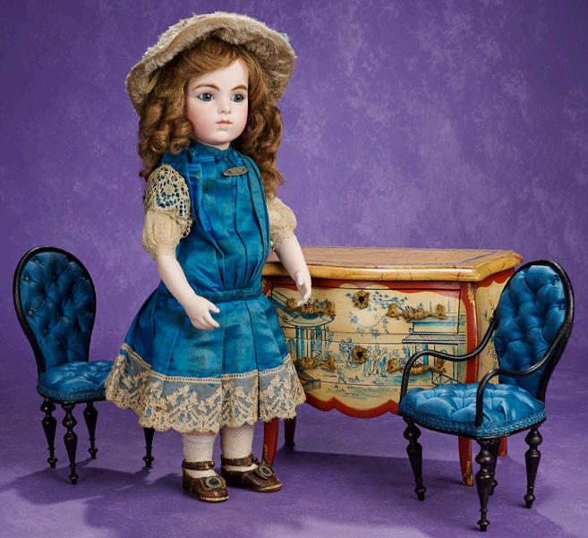 such as featured on the cover of the Theriault’s October 28/29 Marquis auction “And Then She Entered the Room”, made special by her extraordinary coiffure and accessories and costumes. It is this style of doll that highlights the auction, with beautiful poupées by Huret, Rohmer, Jumeau, Bru and Clement. And then there is the environment of the doll. The auction abounds with an exceptional collection of antique doll furniture, some unique maitrise models, some from prestige Paris shops such as Maison Giroux and Au Nain Bleu, and with decorative accessories including bountiful porcelains and gilt ormolu. Too, there are costumes! The antique costumes you seek for the dolls you already cherish are plentiful in the auction, along with everso-rare tiny accessories.