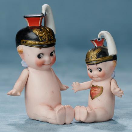 Looking at her work today, O’Neill seems apolitical or, at least, international in spirit. Her important bisque Kewpies were, after all, produced in Germany during the period of WWI, and her only reference to that war was to speak of “those horrible British” who torpedoed a whole shipload of her first bisque Kewpies on their way through the English Channel. The myriad of Kewpie soldiers, created as part of her bisque line, were not soldiers in the traditional sense; their only duty was to fight dreariness and ill-will. The only social movement she overtly supported was woman’s suffrage about which she marched in protest for the vote, and wrote and illustrated many protest pieces.