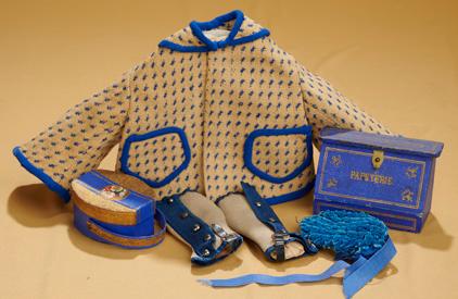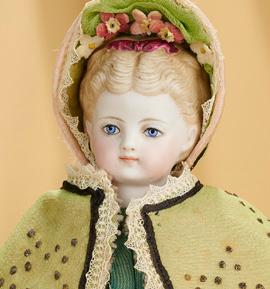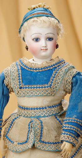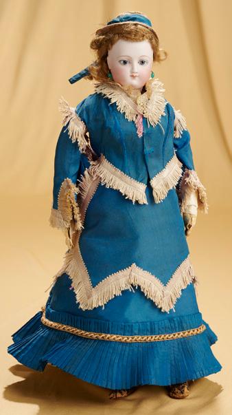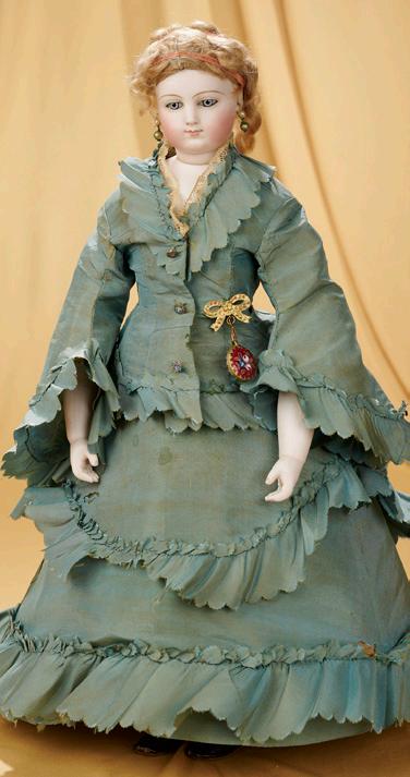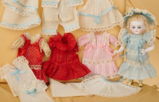 particular focus was directed to the French poupée and the early all-bisque dolls of France and Germany, and it is those categories that are highlighted in her auction collection. The artistry of Adelaide Huret was a particular fascination for her, and the collection includes three fine examples of the Huret poupée as well as furnishings and costumes that bear the Huret signature. As for the poupées of Leontine Rohmer, Miss Lily is not alone as there are several other fine examples, each with an important feature introduced by that firm, and many with complete trousseaux. Other poupées are presented by studios of Bru, Simonne, LavallePeronne, Au Nain Bleu, Aux Reves des Enfances and Giroux & Cie, many with wooden bodies, and all with fine antique costumes.