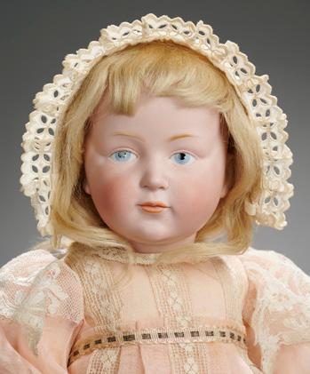 25” (64 cm.) Bisque socket head, blue glass sleep eyes, dark eyeliner, painted curly lashes, short feathered brows, accented eye corners and nostrils, open mouth with outlined lips, two porcelain upper teeth, tongue, blonde mohair wig over plaster pate, composition baby body. Condition: generally excellent. Marks: Q made in Germany 20 237 JDK Jr. Ges Gesch N 1070. Comments: Kestner, circa 1914, earliest variation of the Hilda model. Value Points: very rare largest size made, finest bisque and complexion, original body and body finish, superb antique multi-layered costume. $1200/1600