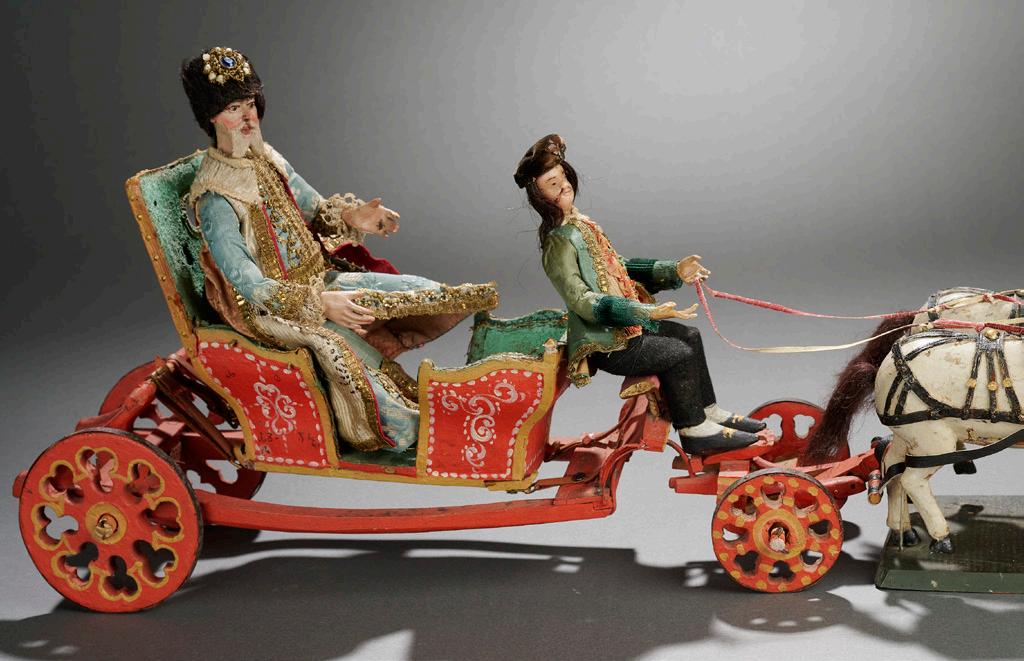 8” (20 cm.) The carved wooden figure of a man with carved painted costume, bare feet, sculpted hair, is posed upon a wooden platform, with wooden peddler basket attached to his back, in which is preserved a little wooden doll head. When the basket is pushed forward and back, the man’s mouth opens and closes as though “peddling”. Excellent condition. Germany, early 1800s. $500/700