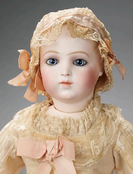 paperweight inset eyes, thick dark eyeliner, painted lashes, rose blushed eye shadow, brushstroked and feathered brows, accented eye corners, shaded nostrils, closed mouth with defined tongue tip between the heart-shaped outlined lips, dimpled chin, pierced ears, original blonde mohair wig over cork pate, French kid bébé body Chevrot hinged hips, wooden lower legs, kid-over wooden upper arms, bisque forearms with separatelysculpted fingers, lovely antique silk costume, bonnet, undergarments, shoes. Condition: generally excellent. Marks: Bru Jne 7 (head and shoulderplate) Bru Bébé Bte SGDG...(original paper label on torso). Comments: Leon Casimir Bru, circa 1884, exceptional beauty of the sought-after rare bébé with finest modeling including defined tongue tip, and beautiful complexion and painting, original body and perfect bisque hands, and with original shoes signed Bru Jne 7 Paris. $17,000/21,00