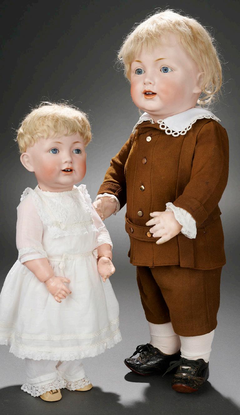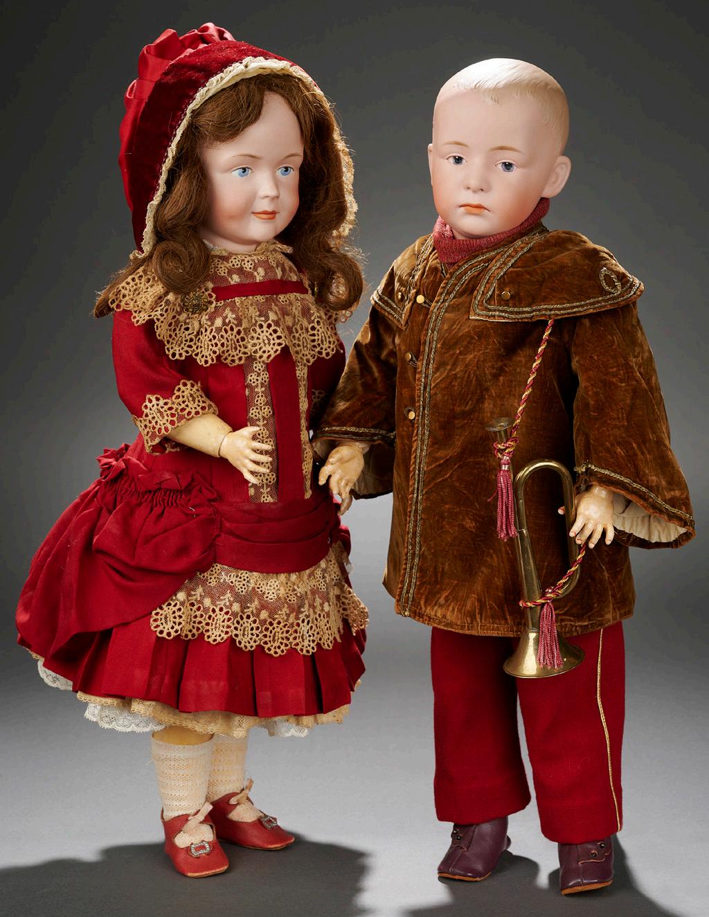 10” (25 cm.) dolls. 15” including base. Each has bisque head with flanged neck, elongated oval face, blue or brown glass inset eyes, dark eyeliner, painted lashes and brows, closed mouth with accent line between the lips, blonde mohair wig, firmly-shaped onepiece torso and legs, wire upper arms, bisque lower arms, and each is posed upon a velvet covered wooden platform which hides below the musical and mechanical movements. Condition: dolls are excellent, presentation is original and mechanisms appear intact albeit need some adjustment. Comments: French, circa 1870, the heads were commissioned from Pierre-François Jumeau by unknown Parisian luxury boutique for this remarkable presentation. Value Points: rare pair, with all original silk costumes of Marquis and Marquise, exquisite portrait face which are very rare to find especially in this tiny size. $2500/3500