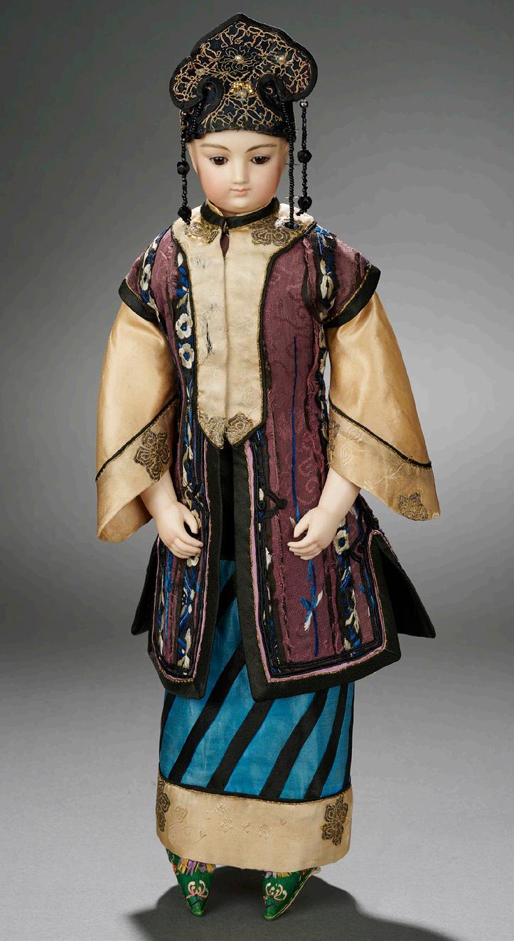 G. Comments: Gaultier, circa 1865, few Gaultier models from this era bear the maker’s initials, this and the uniqueness of the Asian model indicate a special commission doll, probably for the 1867 Paris International Exposition. Value Points: very rare doll with gorgeous complexion and painting, rare signature, very sturdy original body whose rare bisque arms have matching amber-tinted complexion, and outstanding original Asian costume including attached headdress and silk shoes for bound feet. $6000/8000