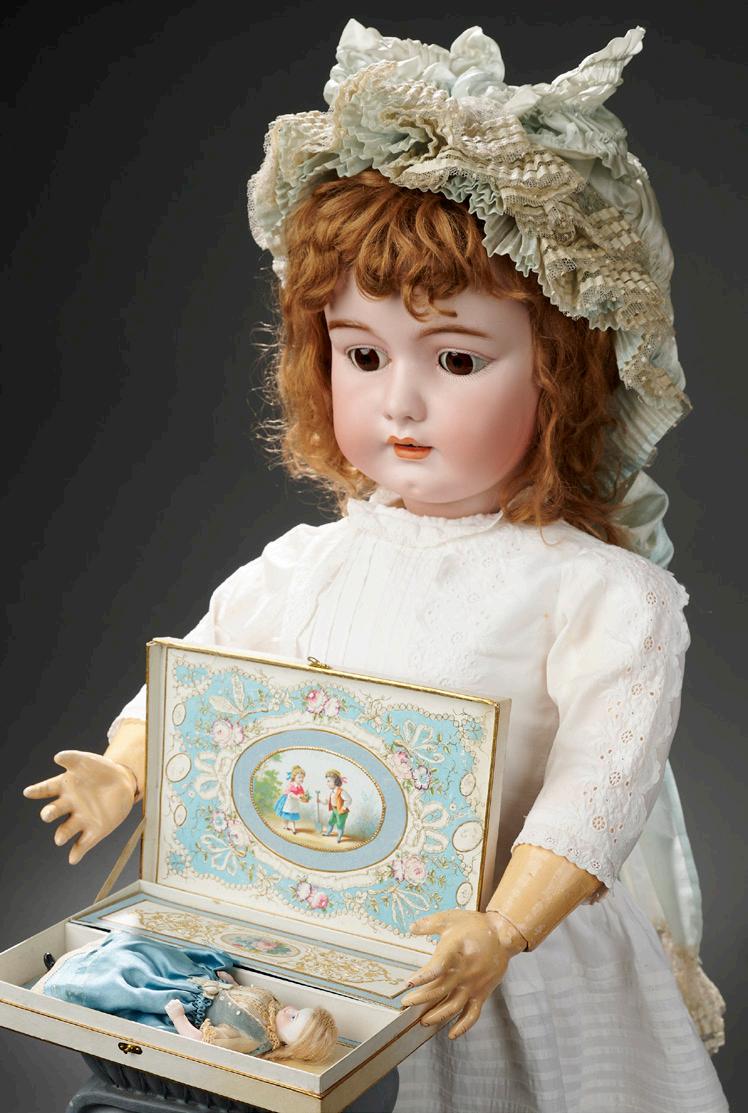 13” (33 cm.) x 9” box. A firm-sided box with ogee-shaping is richly covered with padded ivory silk and hand-painted floral accents, and is surmounted by a silkcovered cornucopia with pleated top edge that frames a bisque doll head that is mounted therein; the doll has brown glass eyes, open mouth, two porcelain teeth, and lively expression. The box lid hinges open for its original use as a luxury candy box, and in a hidden compartment is contained a music box which operates from key wind on the underside. Excellent condition, music box functions, slight fading of silk. Germany, circa 1915. $700/900