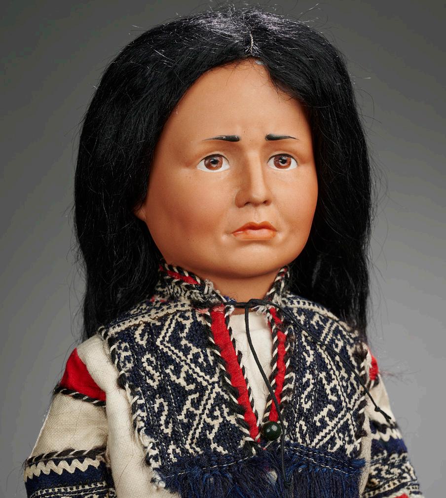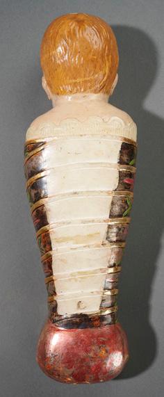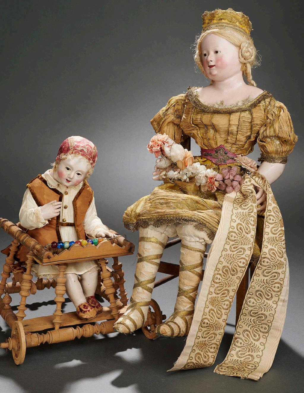 18” (46 cm.) doll. 20” cradle. The carved wooden onepiece poupard with gesso and polychrome finish has exceptional detail of carving, including incised brush marks on hair, defined ears, well-defined eye sockets with painted brown eyes, carved open mouth, tinted brows; and with body shaped as though wrapped in a bunting. Condition: generally excellent. Comments: Italian, 1700s. Value Points: exceptionally fine state of original preservation, with richly carved and painted costume details and facial features; the doll is presented in original wooden cradle with original paint; a note included in the cradle indicates provenance from the Bodmer Collection. $5500/7500