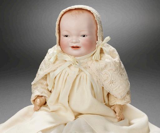 as though open with shaded lips, smiling impish expression, laughter crinkles around the eyes, blonde mohair wig, composition baby body. Condition: generally excellent. Marks: 1428 6. Comments: Simon and Halbig, circa 1912. Value Points: especially fine modeling on the petite rare character, well-defined laughter crinkles and dimples, very choice bisque and painting. $500/700