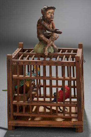 One-piece carved monkey, posed seated on ground knoll, its right arm outstretched, with carved mane of hair encircling the face; along with a wooden cage with sliding door and top, interior feeding trough, in which are captured two exotic birds. Excellent condition. Early 1800s. $400/600