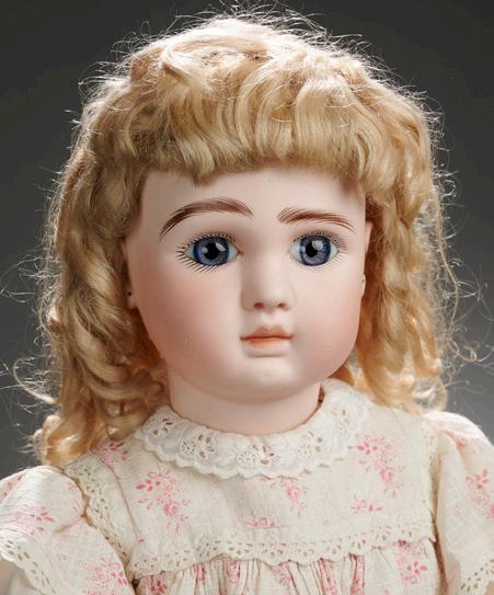 35” (89 cm.) Bisque socket head, blue glass eyes, dark eyeliner, painted lashes, brushstroked brows, accented nostrils and eye corners, closed mouth, accented lips, unpierced ears, blonde mohair wig, composition