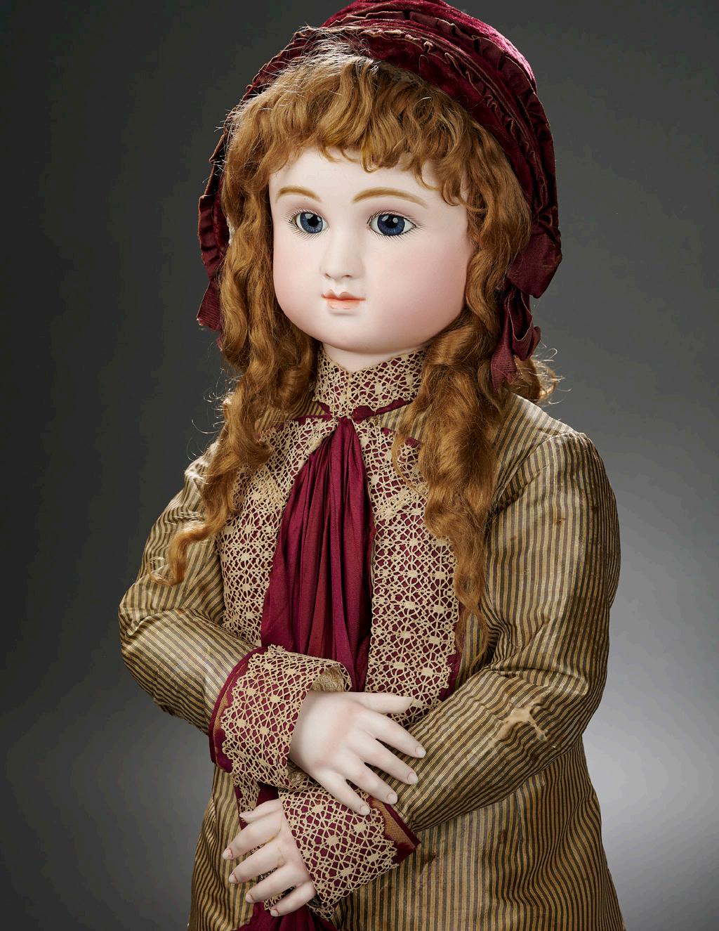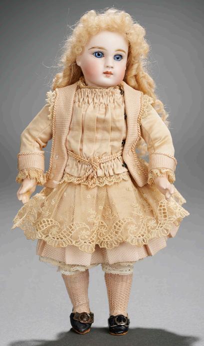 22” (56 cm.) Pale pressed bisque socket head with very plump rounded facial modeling, large blue glass paperweight inset eyes, thick dark eyeliner, painted lashes, rose blushed eyeshadow, multi-feathered brows, small rounded nose with accented nostrils, closed mouth with accent line between the lips, pierced ears, blonde mohair wig over cork pate, French composition and wooden fully-jointed body with loose-ball-jointing, and distinctive metal hands, well costumed in antique velvet suit, white shirt with Buster Brown collar, socks, leather shoes, velvet cap. Condition: generally excellent. Comments: Petit & Dumoutier, circa 1882.